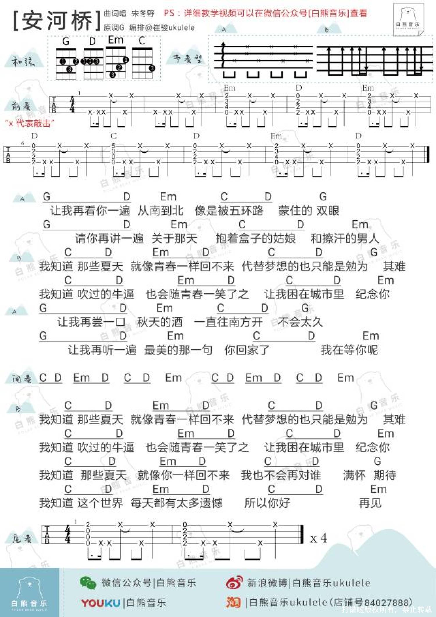 曲谱介绍: 宋冬野《安和桥》_C调尤克里里谱