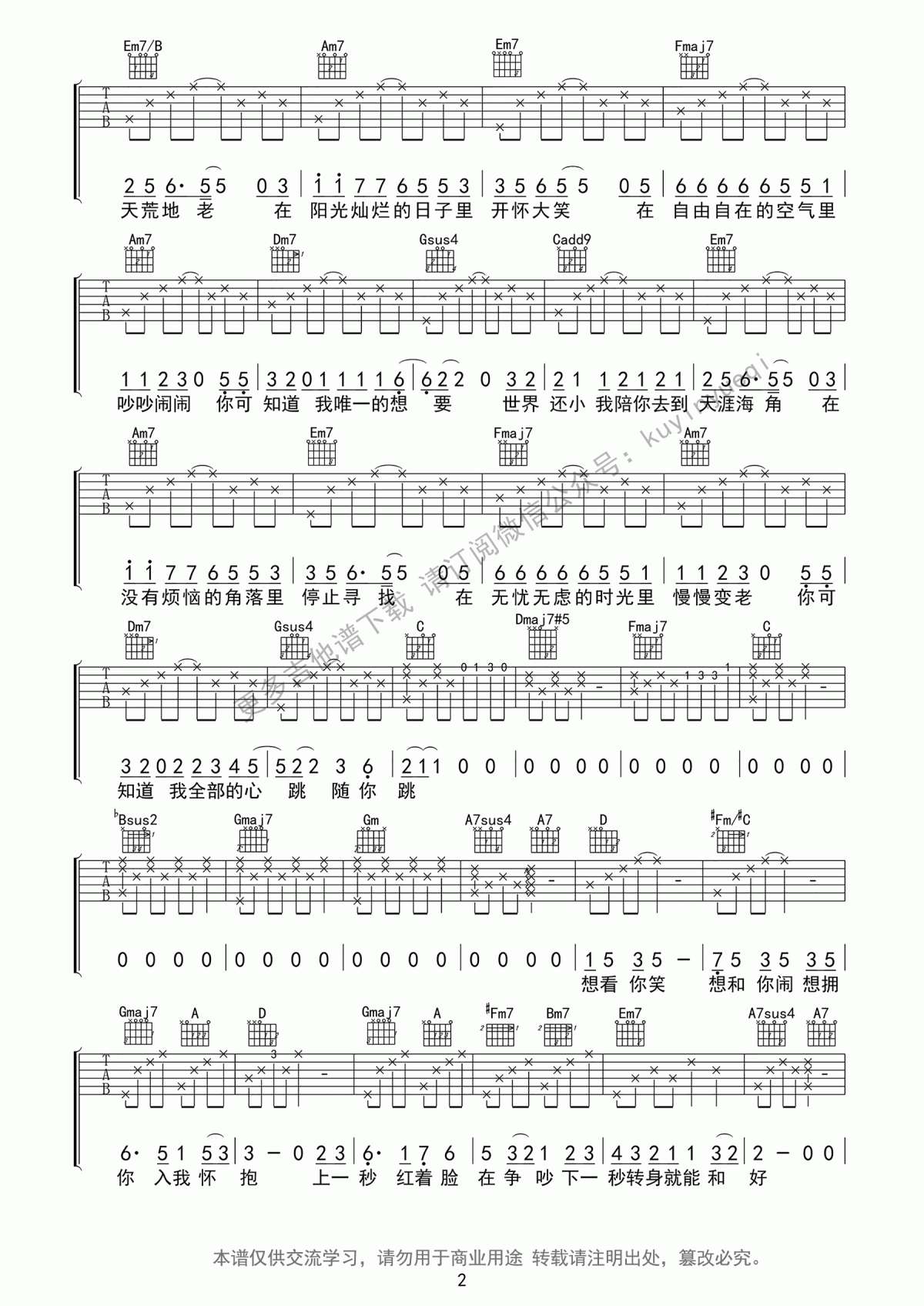 曲谱介绍: 女生版一次就好吉他谱,一次就好吉他六线谱,原调D转F调,选调G调,变调夹根据个人声线选择。如果杨宗纬唱出一种欲望,那么杨宗纬唱出一种期待。杨宗纬唱着一种波浪,而沈腾缺少给人一种朴实而不寻常的感觉。杨宗纬带来的是王子和公主沈腾之间的爱情童话。这是一部现实主义的小说,给平凡的世界带来了丰富的人类情感。