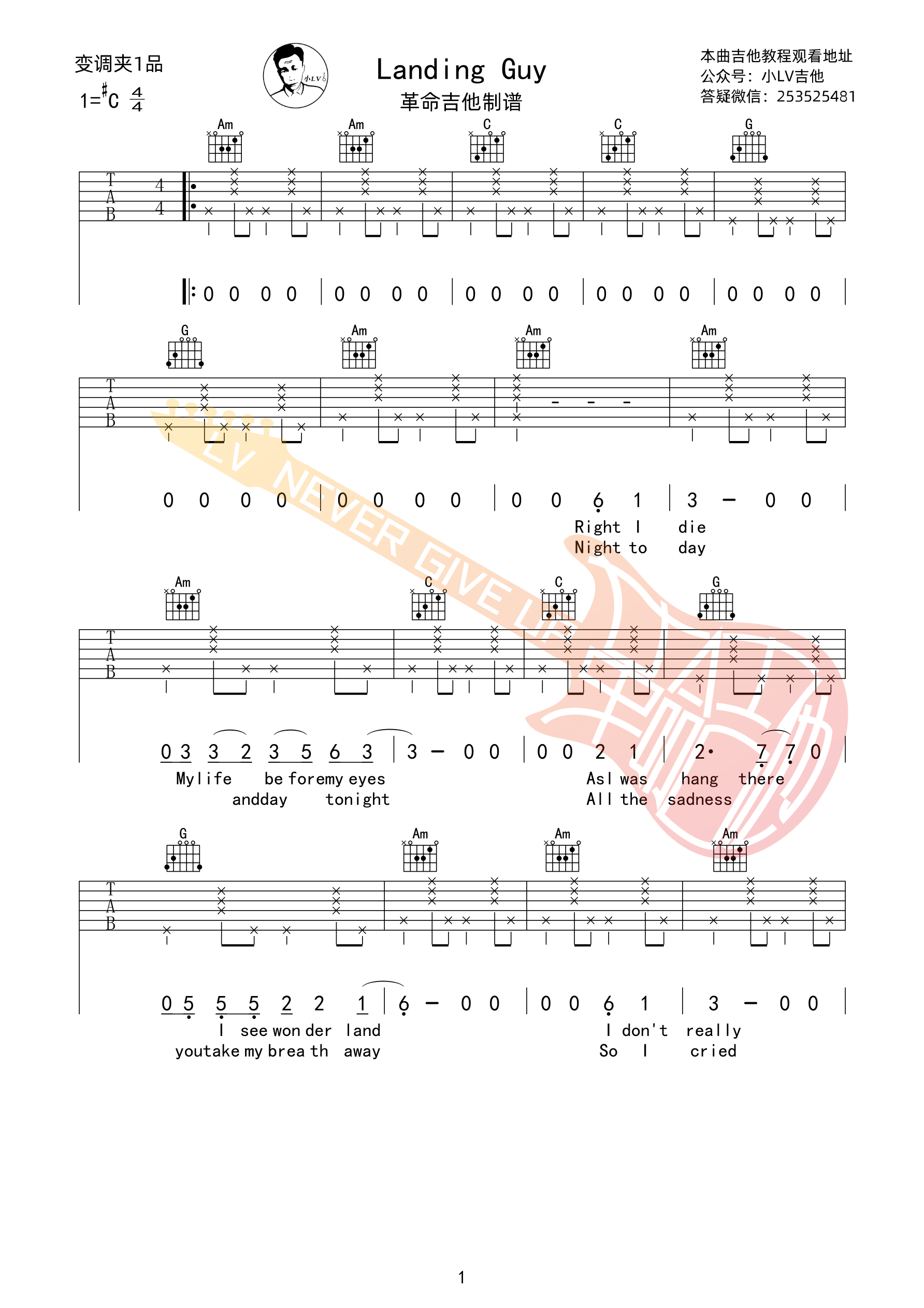 曲谱介绍: 《LandingGuy》吉他弹唱谱,采用C调指法编配,共有4张高清图谱。