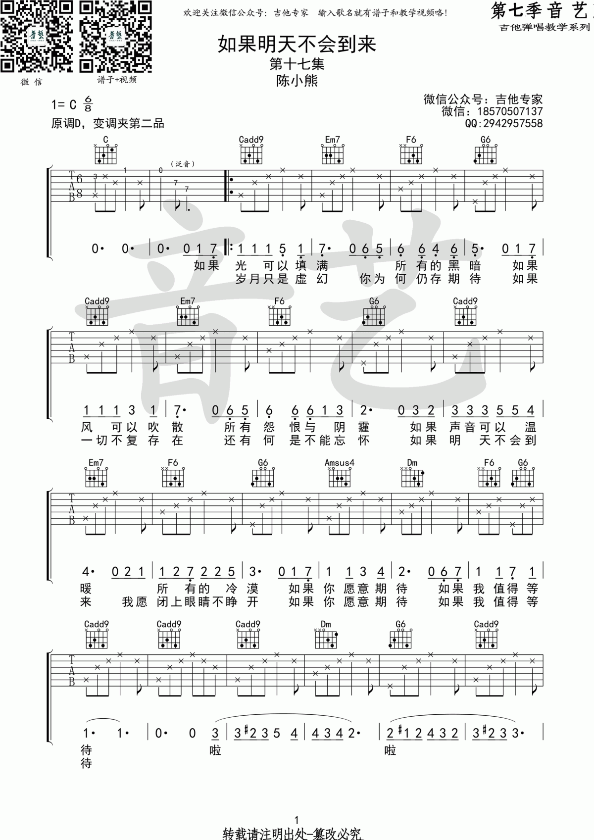 曲谱介绍: 如果明天不会到来吉他谱,如果明天不会到来六线谱,原本陈小熊用的D调编配的,编配为C调的。陈小熊演唱,音乐是从原声吉他制作,上传到网站上的。谢谢你,摇滚猫先生,编辑和分享这首美丽的民歌。根据老师的个人习惯,指法有点变化,非常适合女生唱歌!