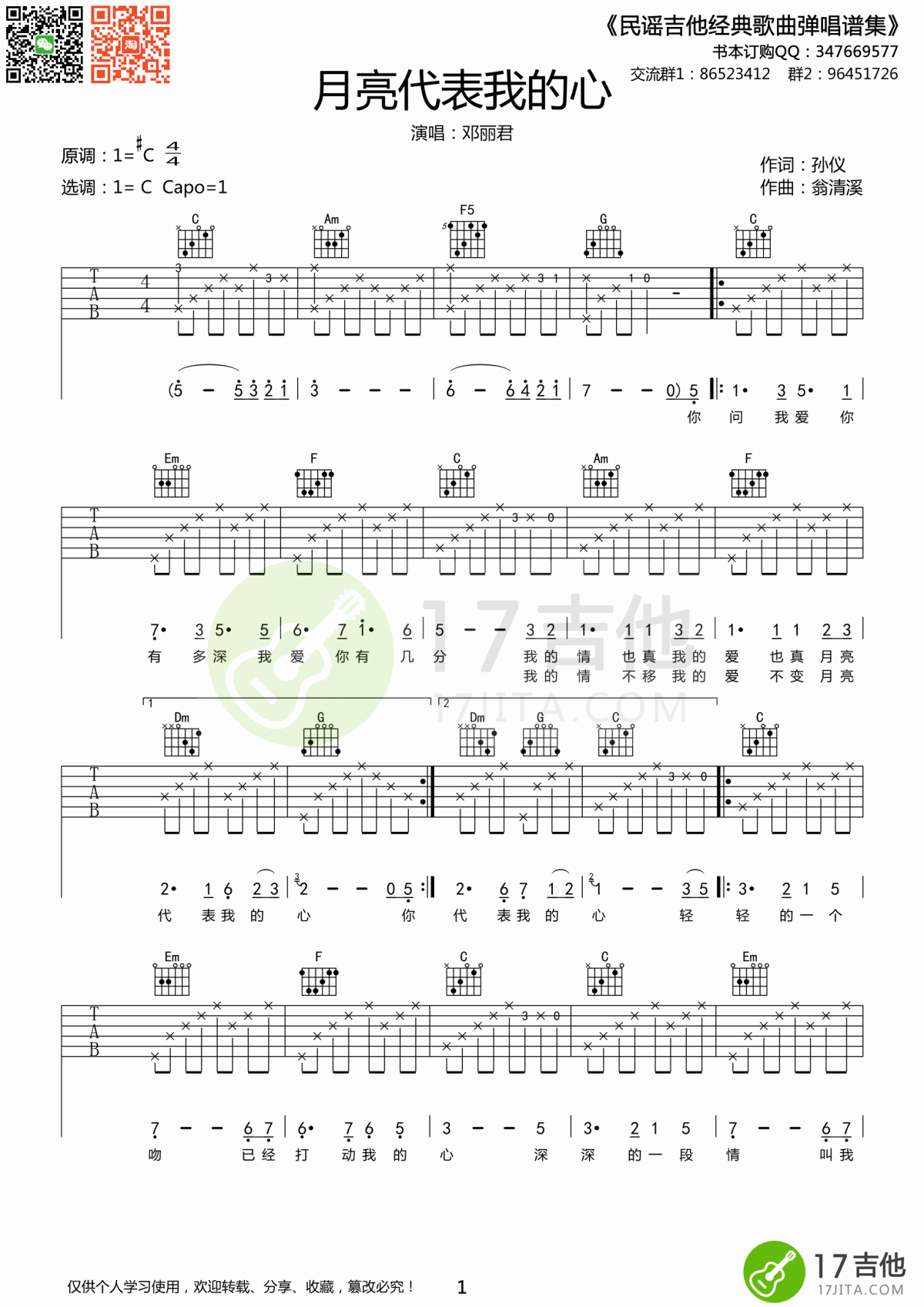 月亮代表我的心吉他谱 - 邓丽君 - C调吉他弹唱谱