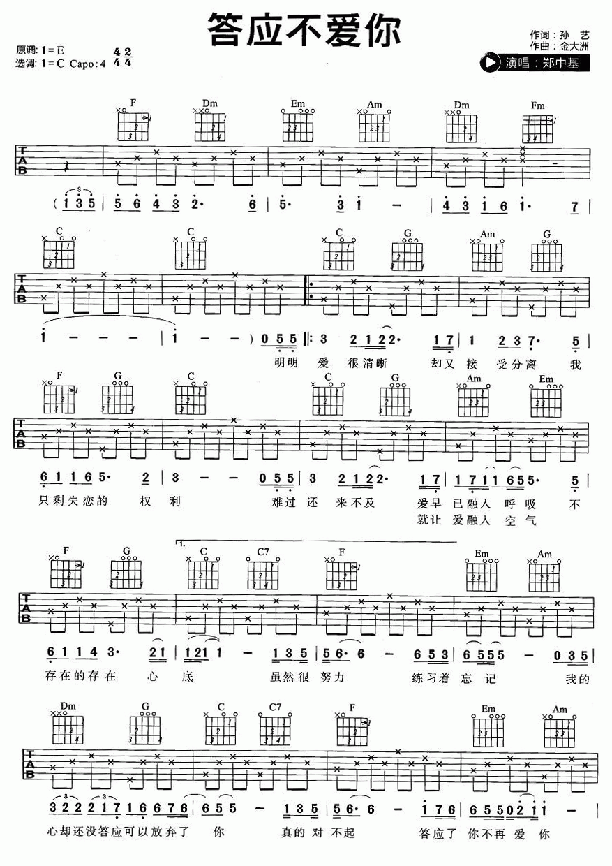 答应不爱你吉他谱 - 郑中基 - 吉他弹唱谱