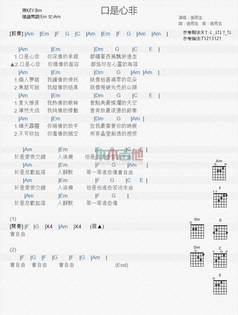 口是心非_吉他谱 - 口是心非 - 吉他弹唱谱