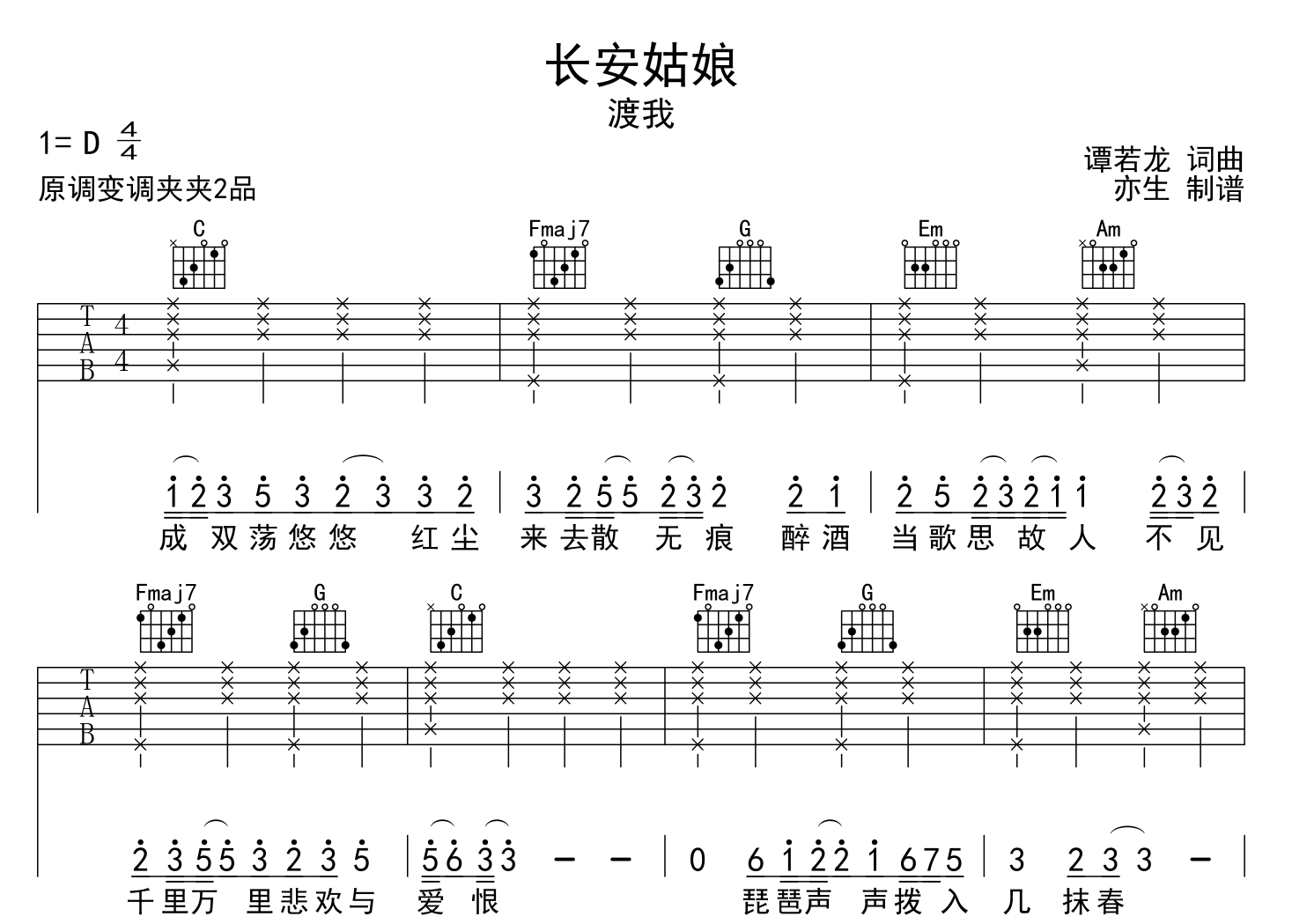 长安姑娘吉他谱 - 渡我 - C调吉他弹唱谱