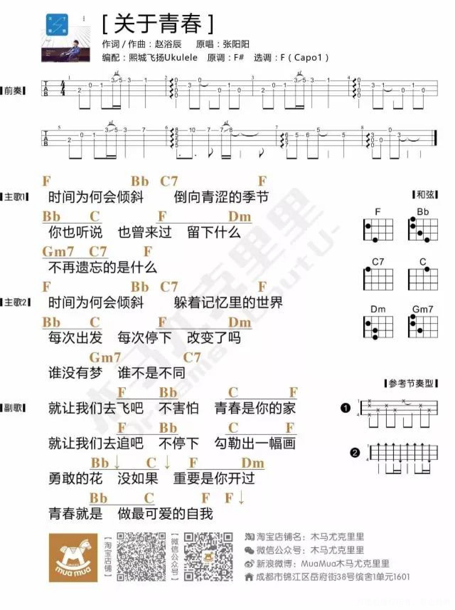曲谱介绍: 张阳阳《关于青春》_F调尤克里里谱