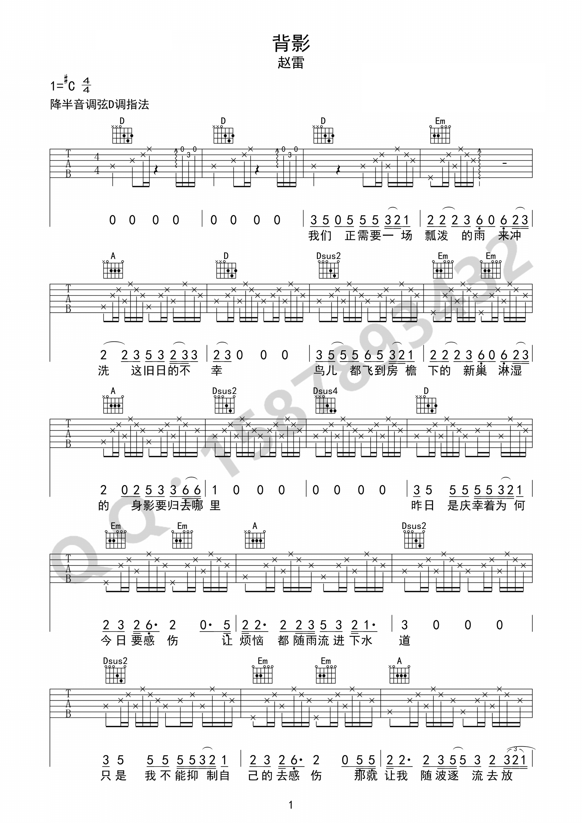 曲谱介绍: 背影吉他谱_赵雷_《背影》D调原版弹唱六线谱_高清图片谱分享,《背影》这首歌是民谣歌手赵雷创作并演唱的一首原创歌曲,被收录在他的首张专《赵小雷》中,一首比较冷门但很能打动人的歌曲。 此版本的曲谱来源于网络,歌曲原调为#C调,这里采用D调指法根据原版编配,需要降半音来进行调弦,但不方便的话也可以不调,谱子很简单,希望大家好好练习。 背影吉他谱_赵雷_《背影》D调原版弹唱六线谱_高清图片谱1: