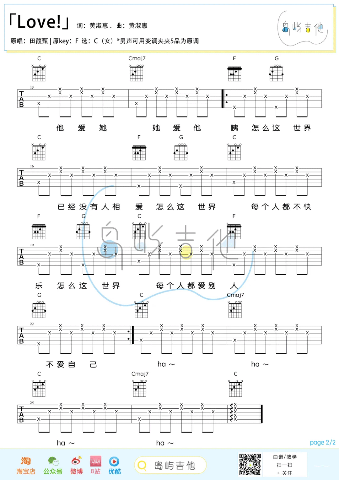 曲谱介绍: 田馥甄《Love》吉他弹唱谱,采用C调指法编配,共有2张高清图谱,免翻页排版设计。