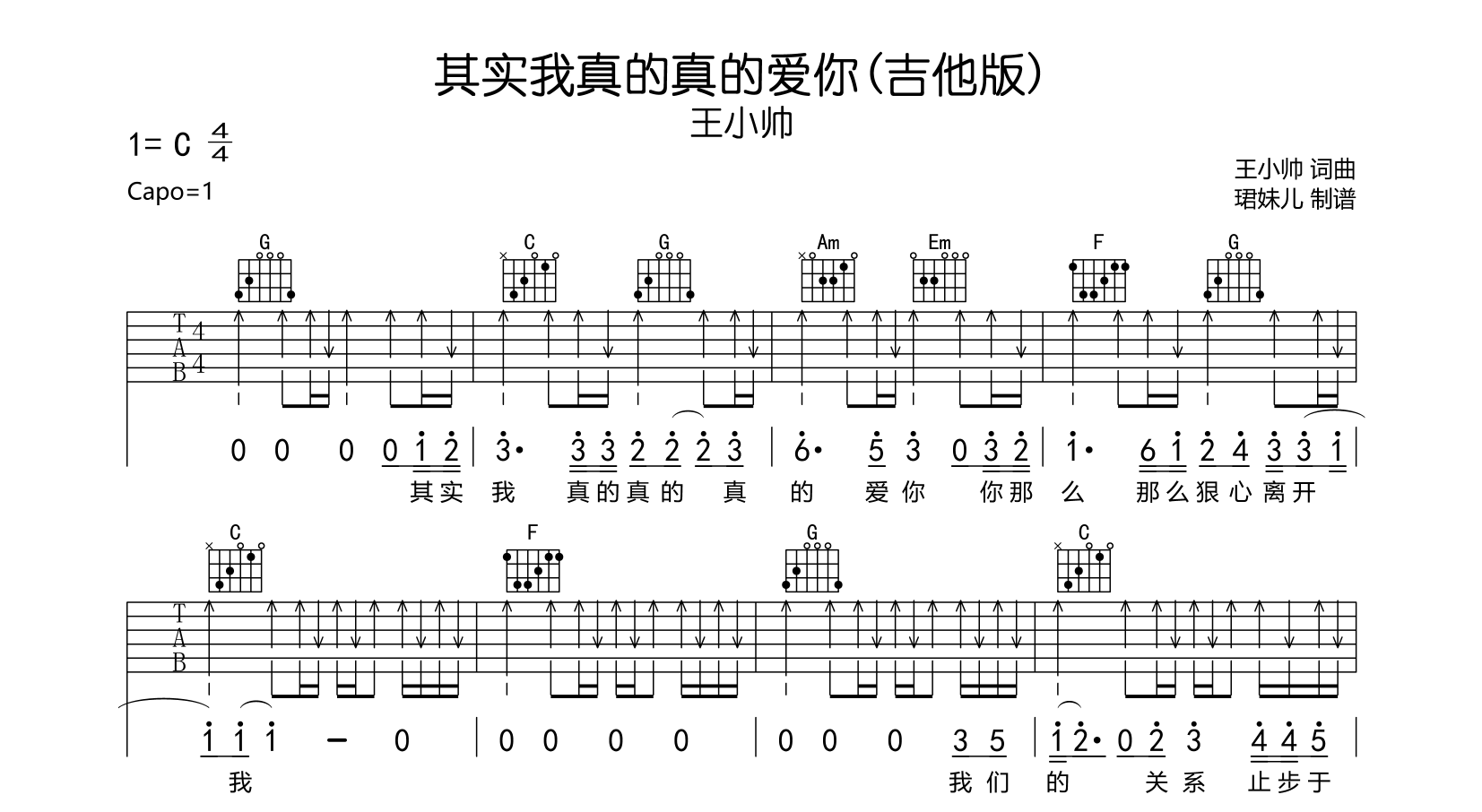 其实我真的真的爱你吉他谱 - 王小帅 - C调吉他弹唱谱