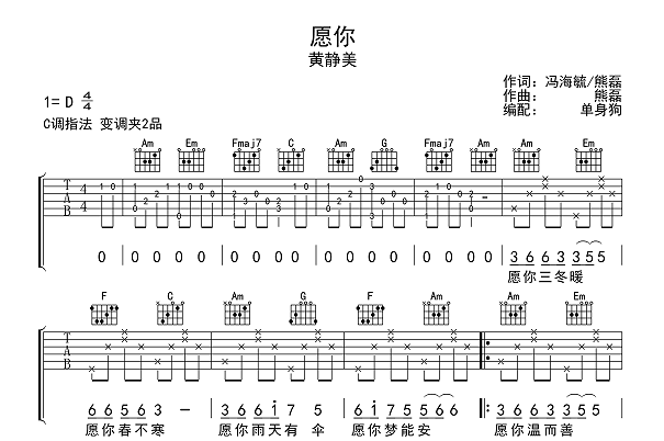 曲谱介绍: 黄静美《愿你》吉他谱_《愿你》C调原版六线谱分享,《愿你》是黄静美演唱的一首网络情歌,愿你三冬暖,愿你春不寒,愿你雨天有伞,愿你梦能安,这首歌曲用了重叠的祝愿形式,表达了发自内心的一种爱意和祈祷,也许由衷而发爱一个人的感受就是来自无数个关于TA的真正“希望”。 黄静美《愿你》吉他谱,创作者@单身狗制谱,选用C调,《愿你》弹唱六线谱,共两张高清图片谱例,弹唱建议夹在二品弹唱D调,包含完整的前奏和尾奏按原版编配,难度初级简单。
