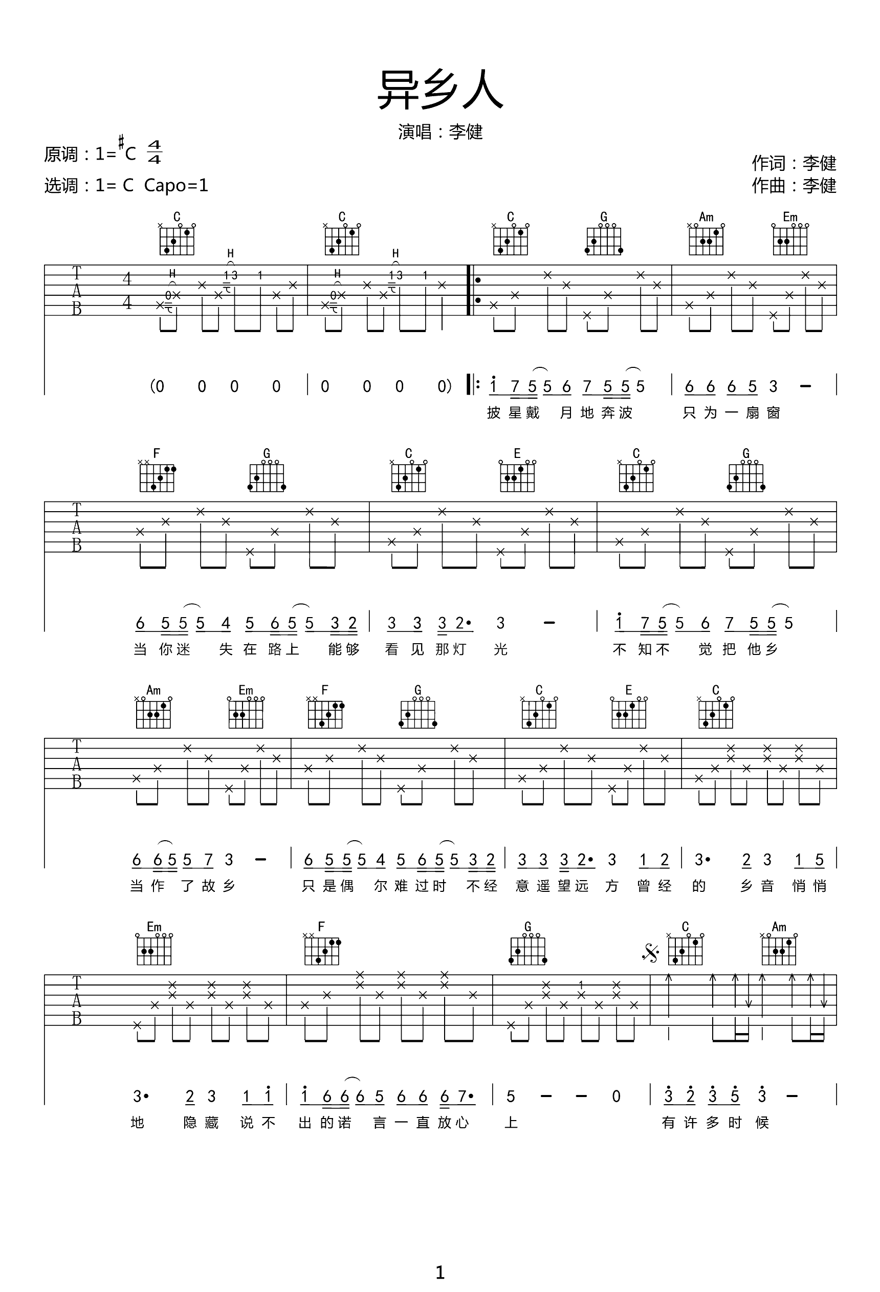 异乡人吉他谱 - 李健 - C调吉他弹唱谱