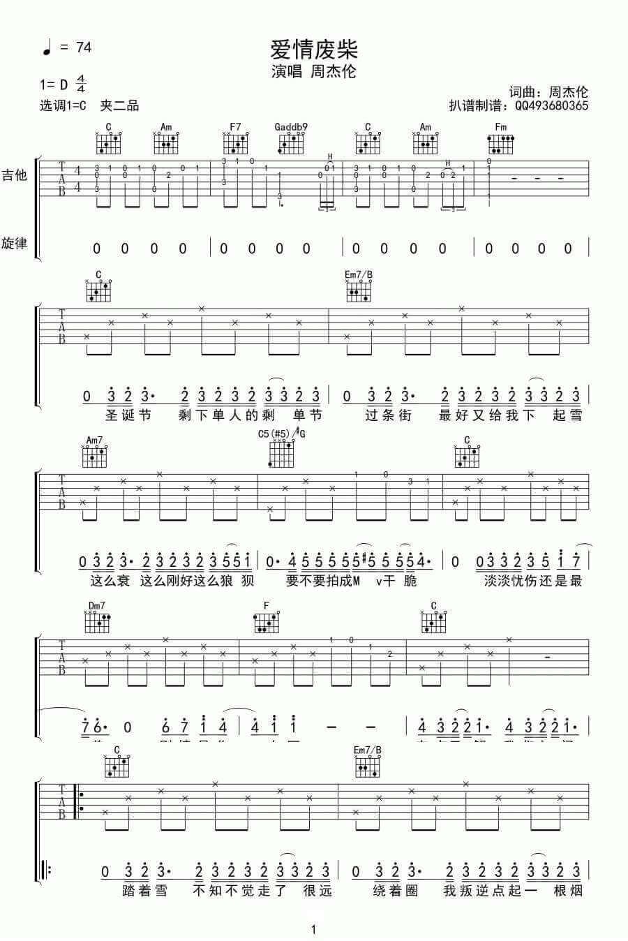 曲谱介绍: 《爱情废柴》吉他谱_周杰伦_C调原版弹唱六线谱_高清图片谱分享,《爱情废柴》是由周杰伦演唱的一首歌曲,由周杰伦作词、作曲并演唱,周式失恋废柴情歌,用耍赖打败爱情的失败。