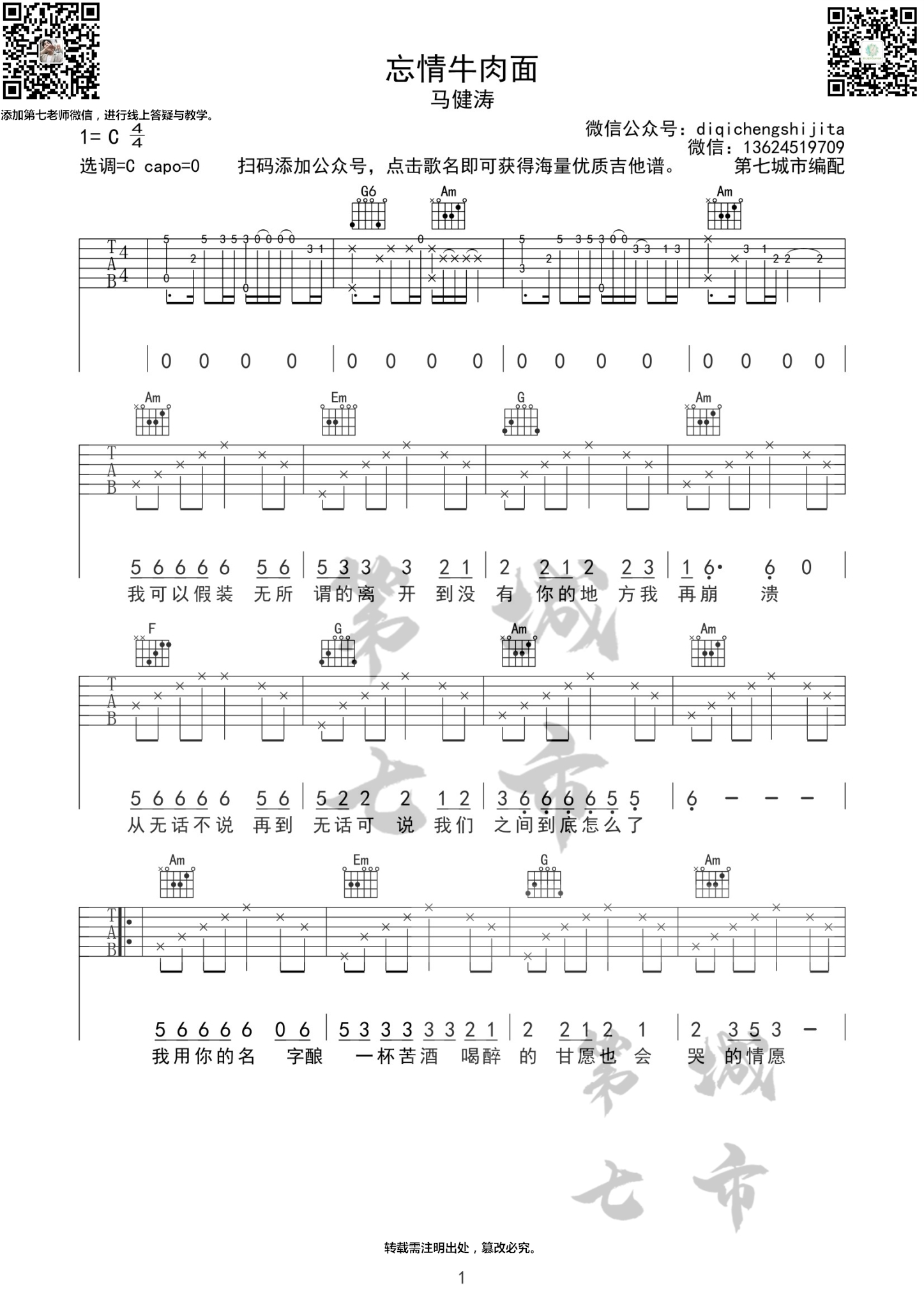 忘情牛肉面吉他谱 - 马健涛 - C调吉他弹唱谱