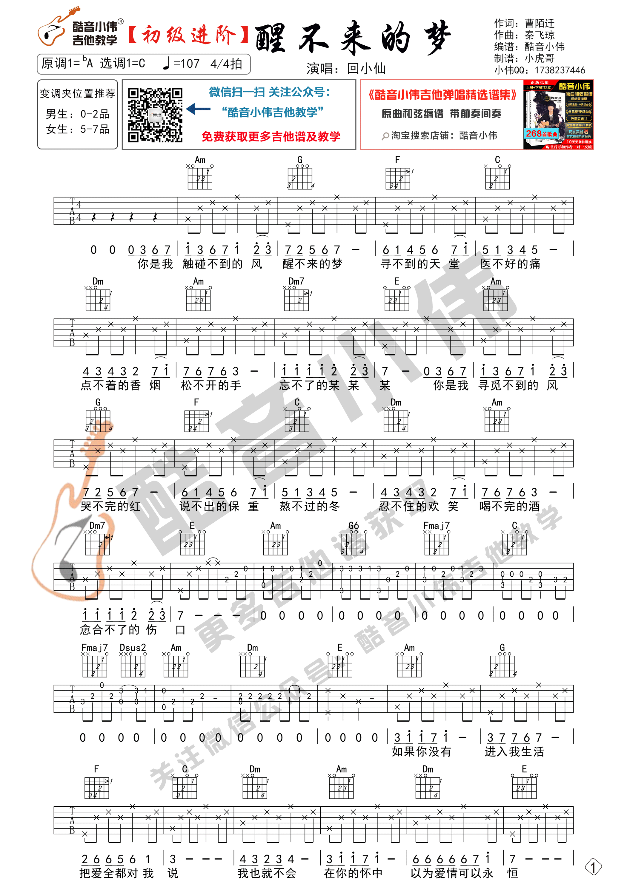 曲谱介绍: 回小仙《醒不来的梦》吉他弹唱谱,采用C调指法编配,酷音小伟吉他教学编配出品,共有2张高清图谱,免翻页排版设计。
