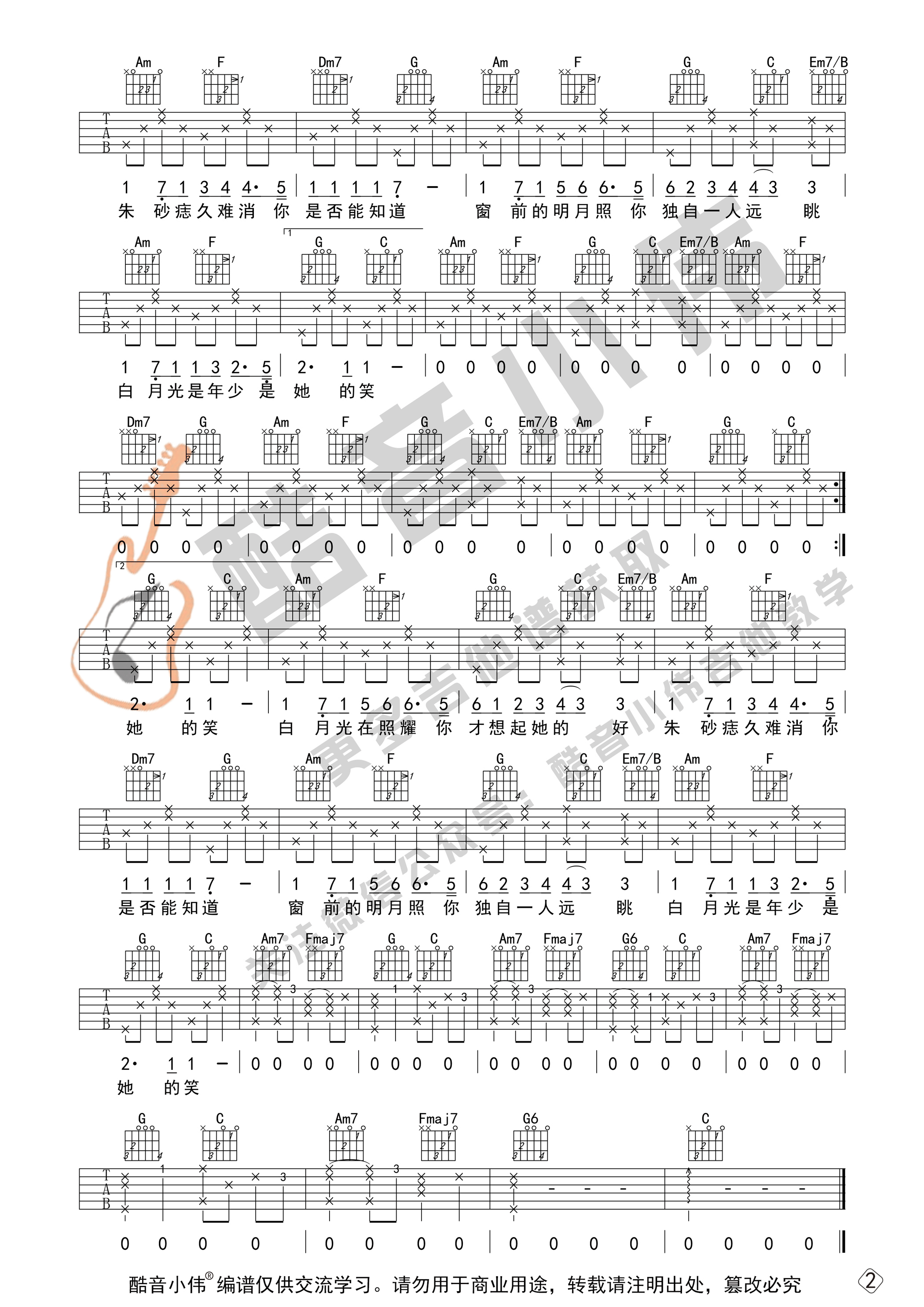 曲谱介绍: 曲谱适合初学者弹奏,选用C调指法,变调夹的位子可以根据我的推荐来选择。使用八分音符、十六分音符分解伴奏型,先弹奏会曲谱,再清唱会,然后弹唱结合一起练习。《白月光与朱砂痣》是由大籽演唱的歌曲,“寄予希望却无法拥有的叫白月光,拥有却无法再拥抱的人叫朱砂痣”。将白月光朱砂痣串联了起来,用作比喻爱情。