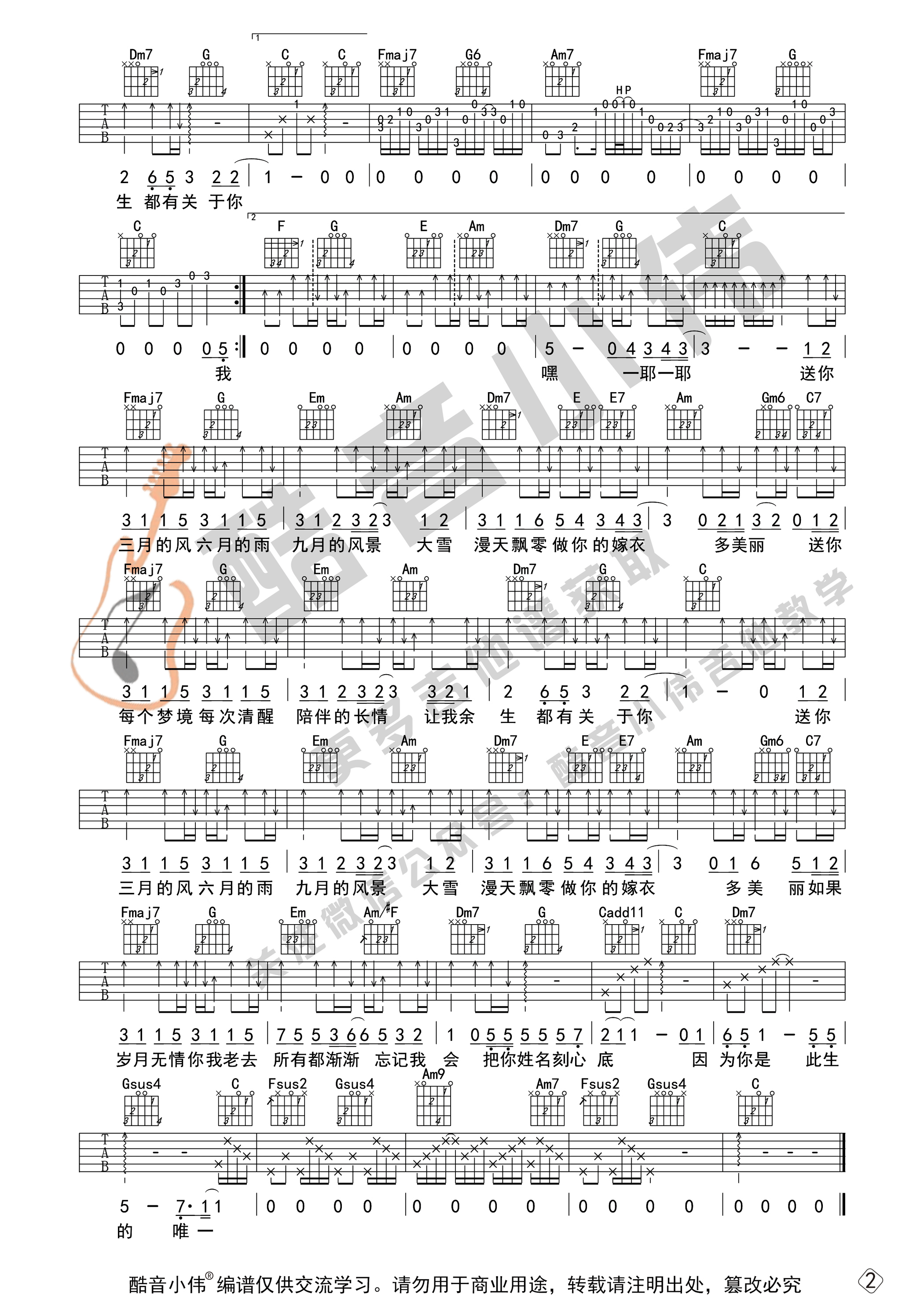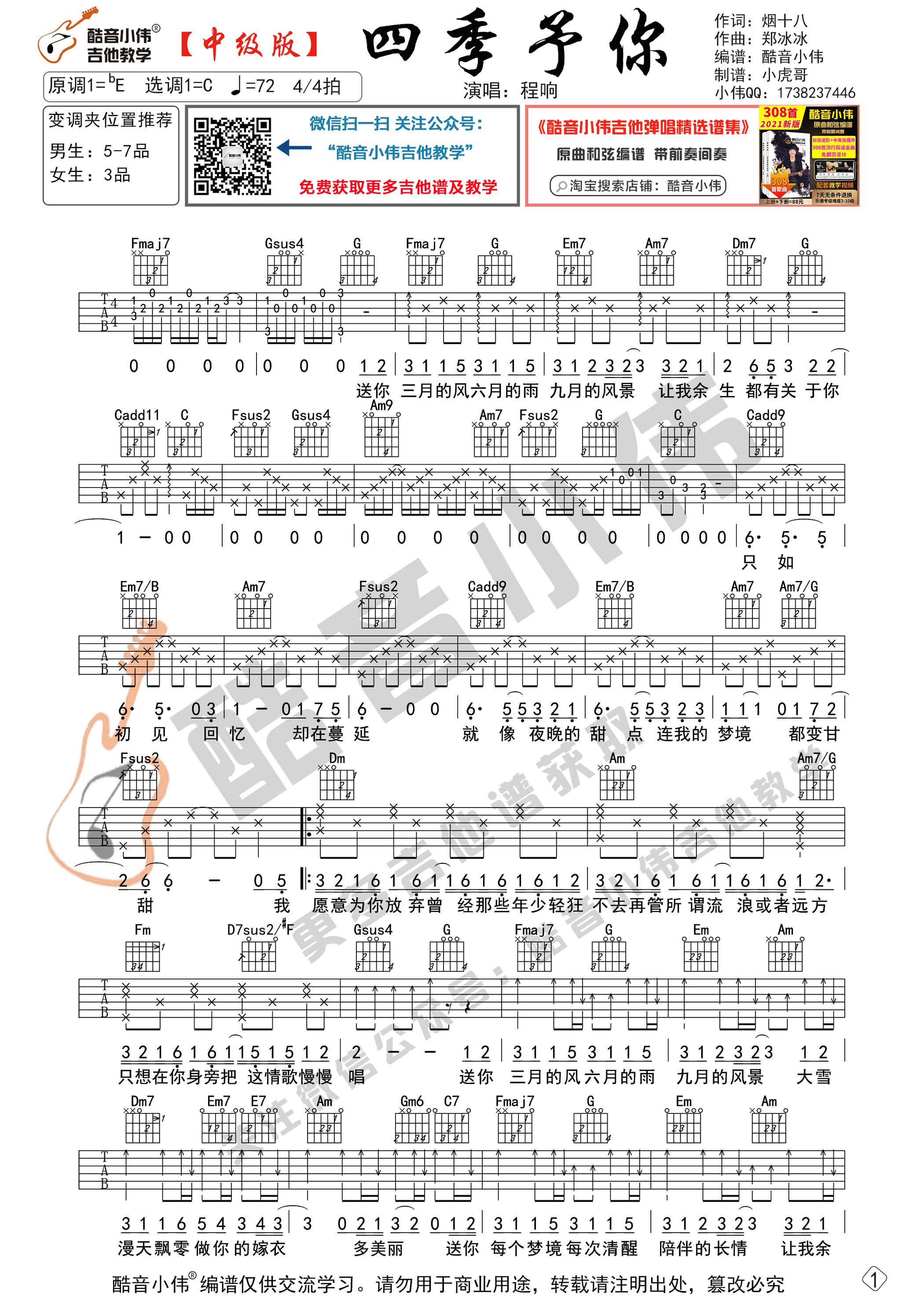曲谱介绍: 曲谱适合有一定基础的琴友弹奏,选用C调指法编谱,变调夹的位子可以根据我的推荐来选择。本曲的节奏型变化偏多,有多种的分解和扫弦节奏型,练习帮助提升水平,先弹奏会曲谱,再清唱会,然后弹唱结合一起练习。《四季予你》是由程响演唱的歌曲,歌曲以"四季”的风花雪月为隐喻,讲述了主人公的浪漫情愫和对爱情的永恒追求,是一首叫人听了就感到温暖与清新的治愈歌曲。四季轮回即是一生,唯有往后余生。