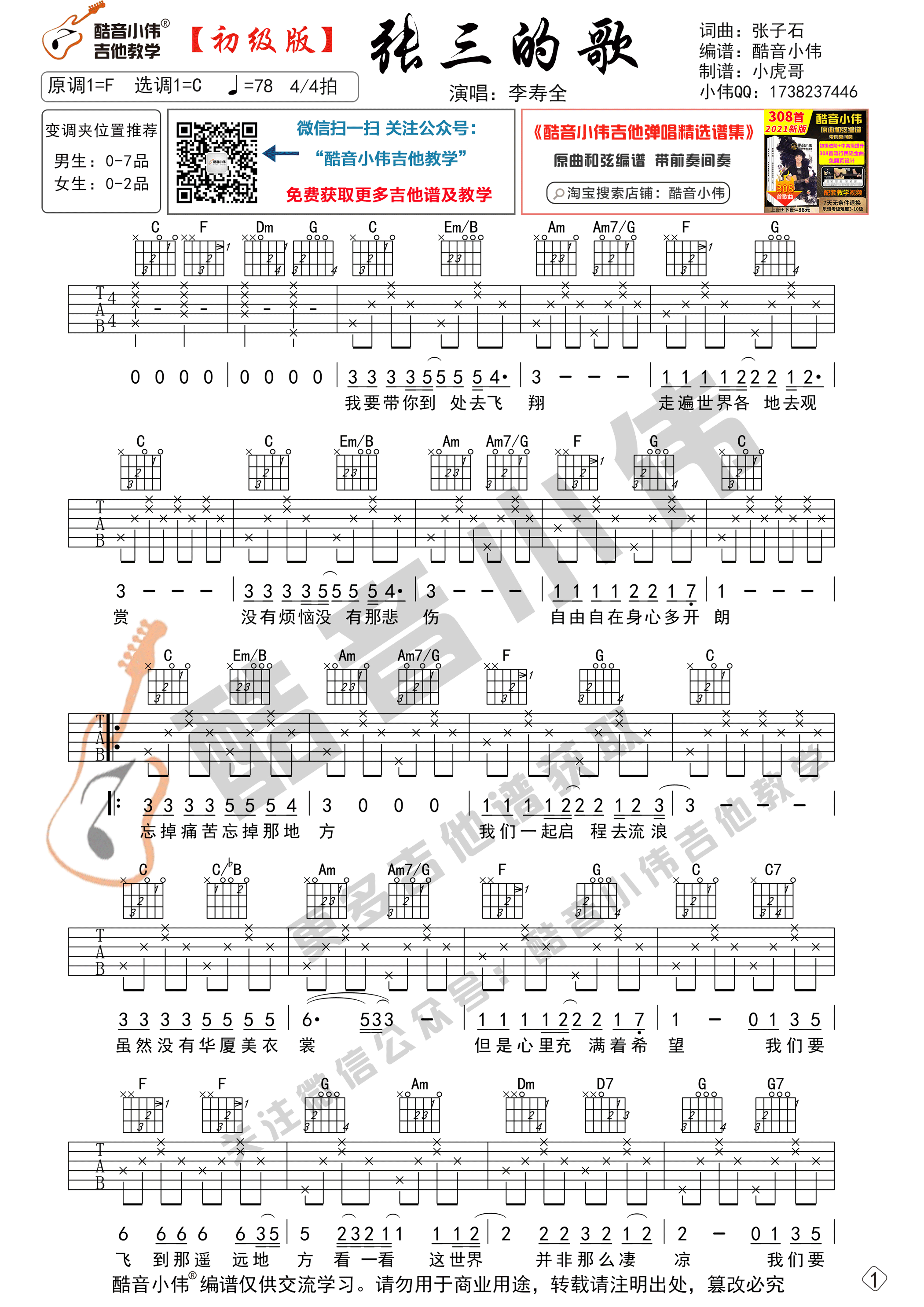 曲谱介绍: 曲谱适合初学者弹奏,选用C调指法,变调夹的位子可以根据我的推荐来选择。使用8分音符分解伴奏型,可以帮助更好的练习,先弹奏会曲谱,再清唱会,然后弹唱结合一起练习。《张三的歌》是台湾歌手齐秦在2010年翻唱的一首歌曲,该歌曲原唱为李寿全。这首歌得创作者张子石在写这首歌的时候刚在美国办了离婚手续,带着两个孩子流浪在异国他乡,颠沛流离,饱尝辛酸,歌中的“张三”也并非是他自己,而是代言了所有张三李四一样的小人物,张三和李四就像是身边的你和我。