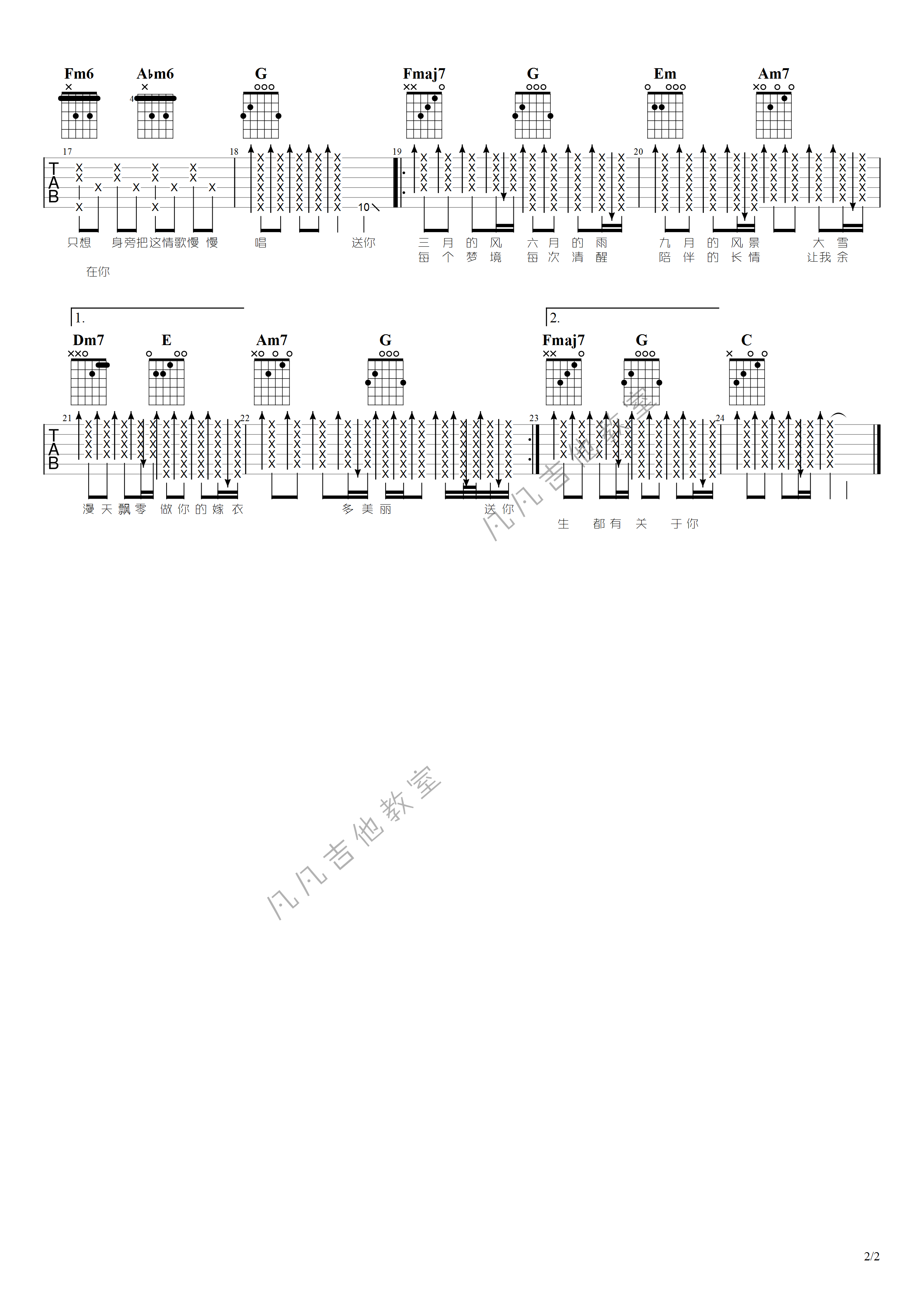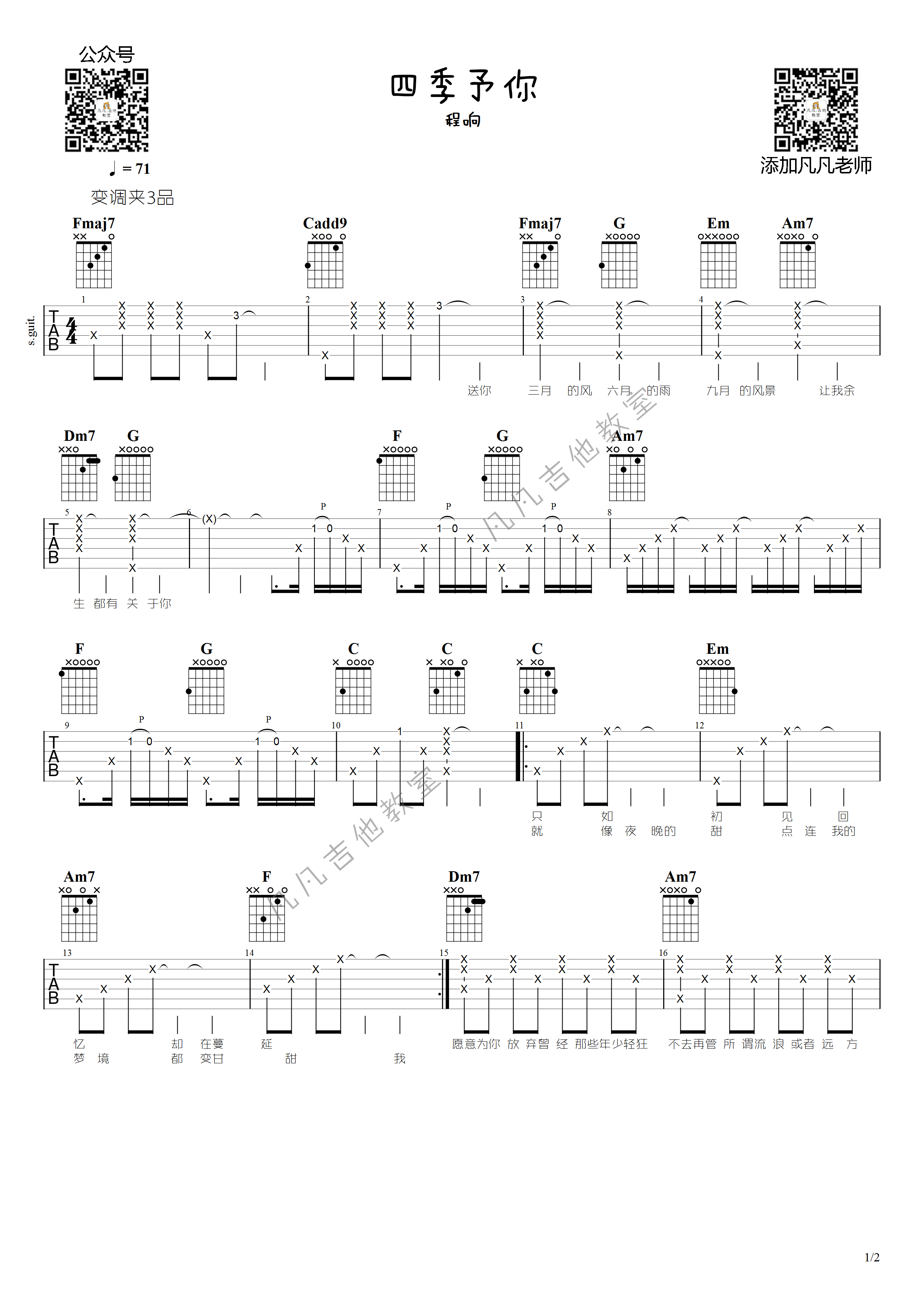 曲谱介绍: 四季予你吉他谱采用了C调指法,由凡凡吉他教室编配制作。