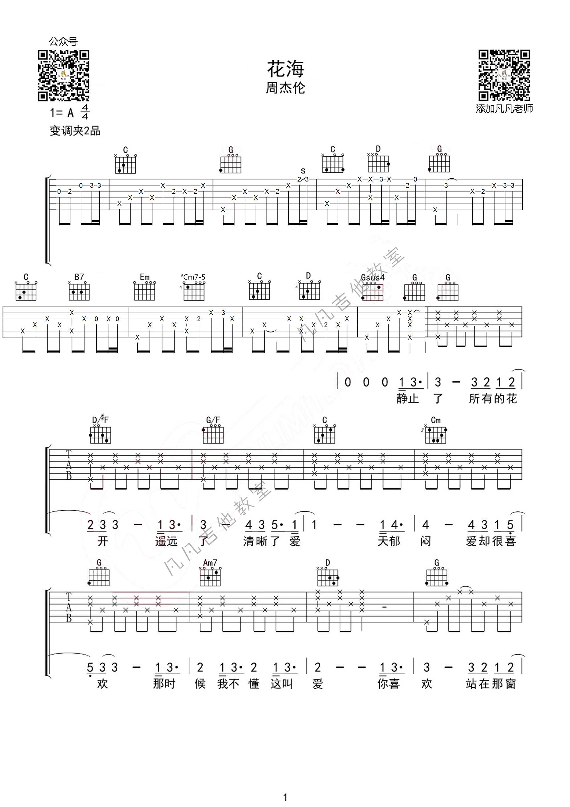 曲谱介绍: 花海吉他谱采用了A调指法,由凡凡吉他教室做谱完成。《花海》是周杰伦演唱的一首歌曲,由周杰伦作曲,这是一首充满岛国风情的歌曲,周杰伦以海岛唱腔演唱,有种抚慰人心的力量 。周杰伦在歌曲开场的声音似“半梦半醒”,后来越唱越“清醒”,为这首抒情歌曲增添了趣味性 。周杰伦在这首歌里也挑战了高音,这首英式摇滚抒情结合了民族风,散发出一丝悠悠的花香。