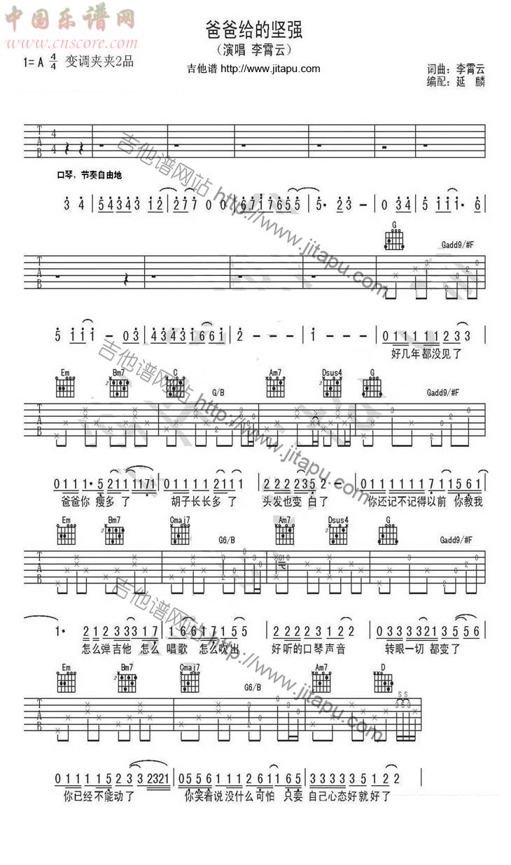 曲谱介绍: 李霄云《爸爸给的坚强》吉他弹唱谱,采用A调指法编配,吉他谱网站编配出品,共有1张高清图谱,免翻页排版设计。