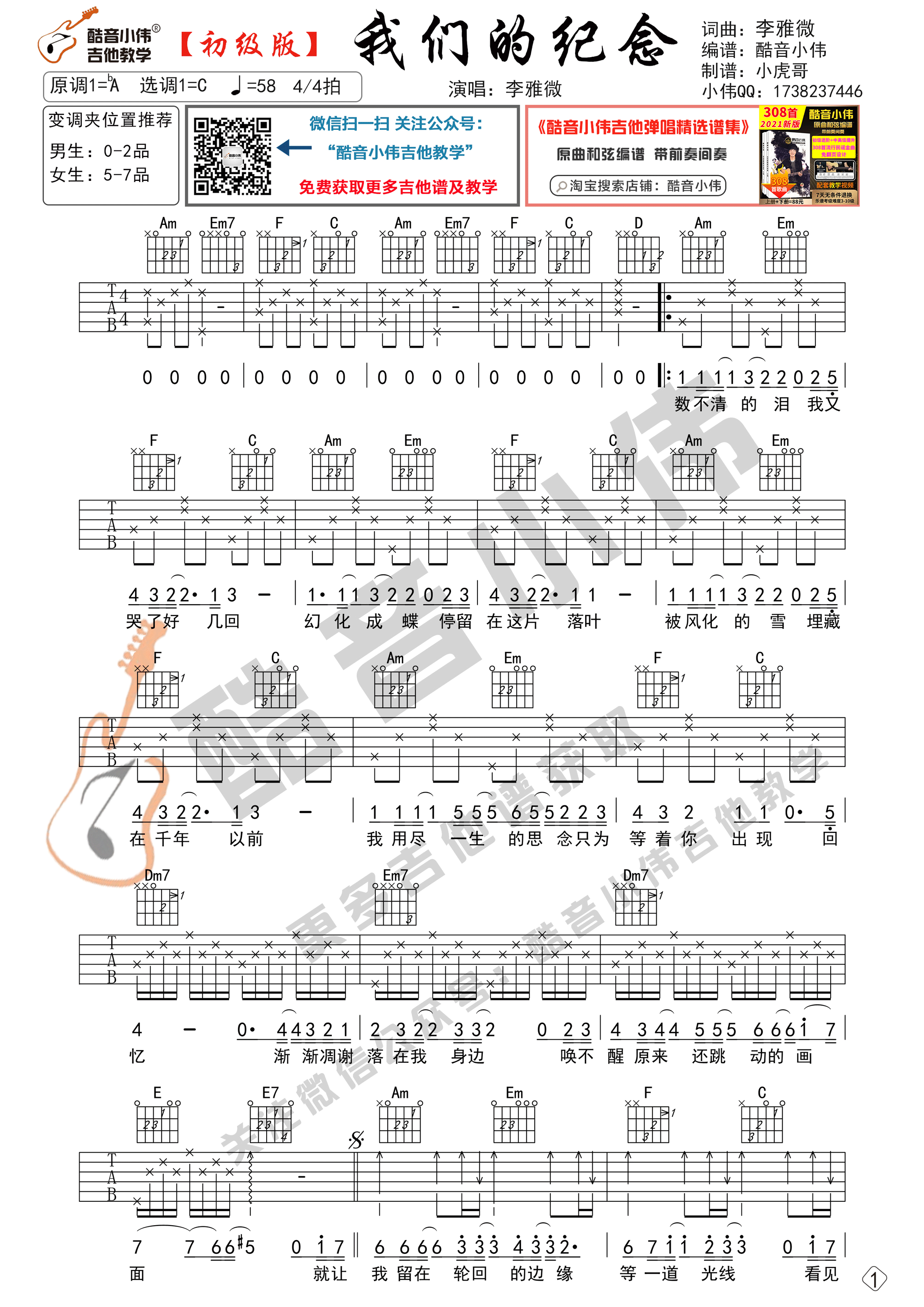 曲谱介绍: 我们的纪念吉他谱采用了C调指法,由酷音小伟编配完成。这首曲谱适合初学者练习,选用C调指法,变调夹的位子可以根据我的推荐来选择,使用八分音符分解伴奏型弹奏,先弹奏会曲谱,再清唱会,然后弹唱结合一起练习,这首歌曲受到了很多人的喜爱,在这首歌曲之中,总是勾起很多人的美好记忆。