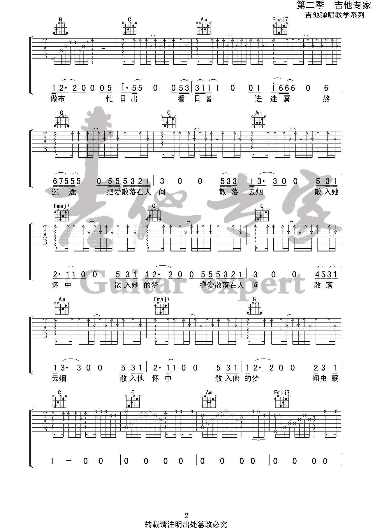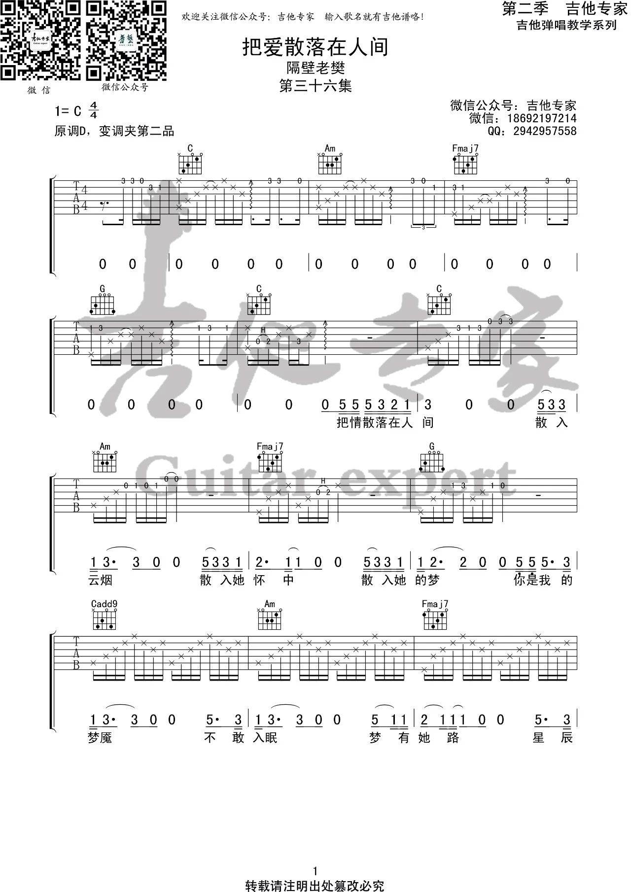 曲谱介绍: 隔壁老樊《把爱散落在人间》吉他弹唱谱,采用C调指法编配,吉他专家编配出品,共有4张高清图谱。