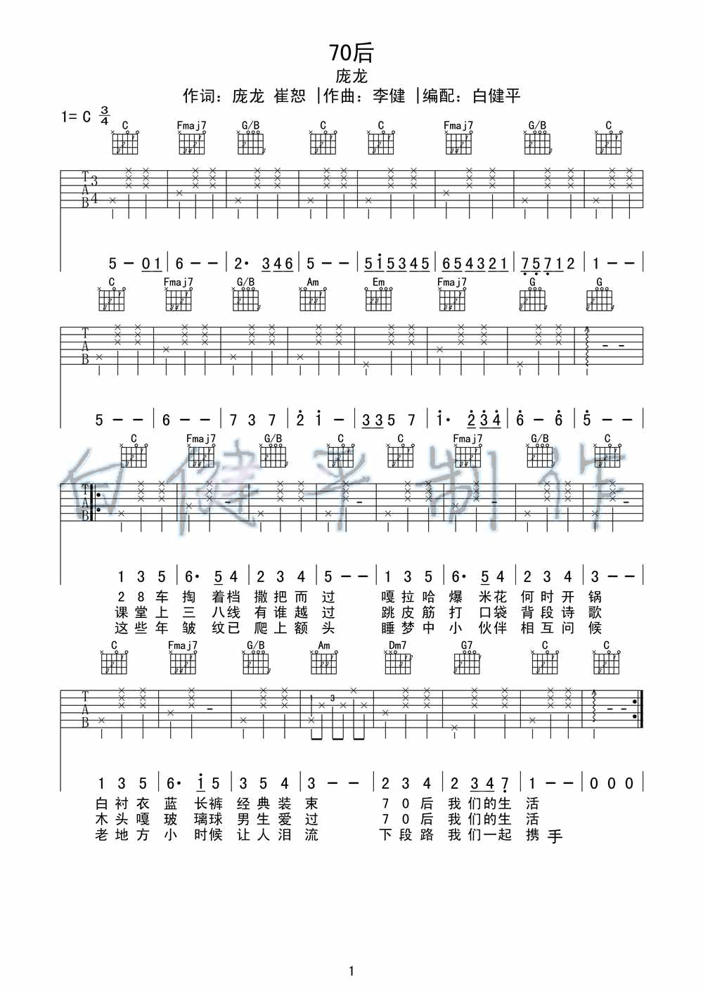 曲谱介绍: 庞龙《70后》吉他弹唱谱,采用C调指法编配,白健平编配出品,共有3张高清图谱。