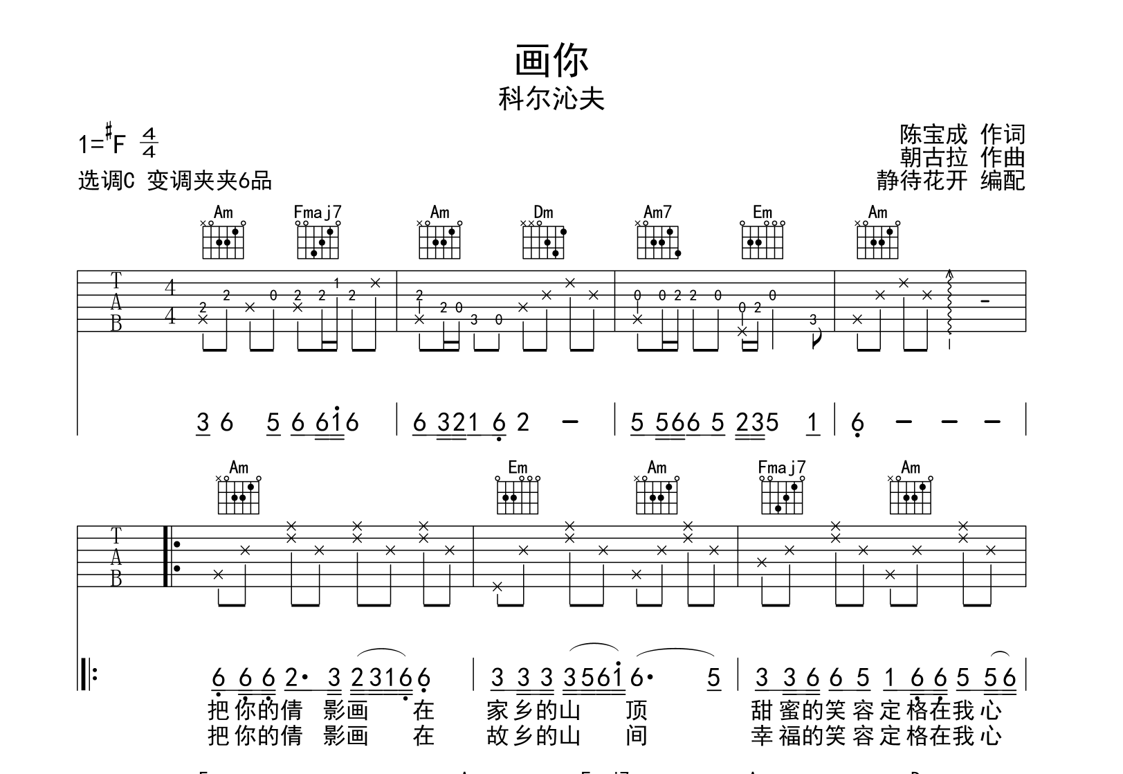 曲谱介绍: 画你吉他谱,科尔沁夫演唱的一首歌曲,本吉他谱采用C调指法编配,来自@静待花开编配制作,变调夹夹第6品演奏,原调#F调,也可以根据个人嗓音条件灵活选择变调夹,演奏的速度控制在每分钟70拍左右,演奏难度简单。