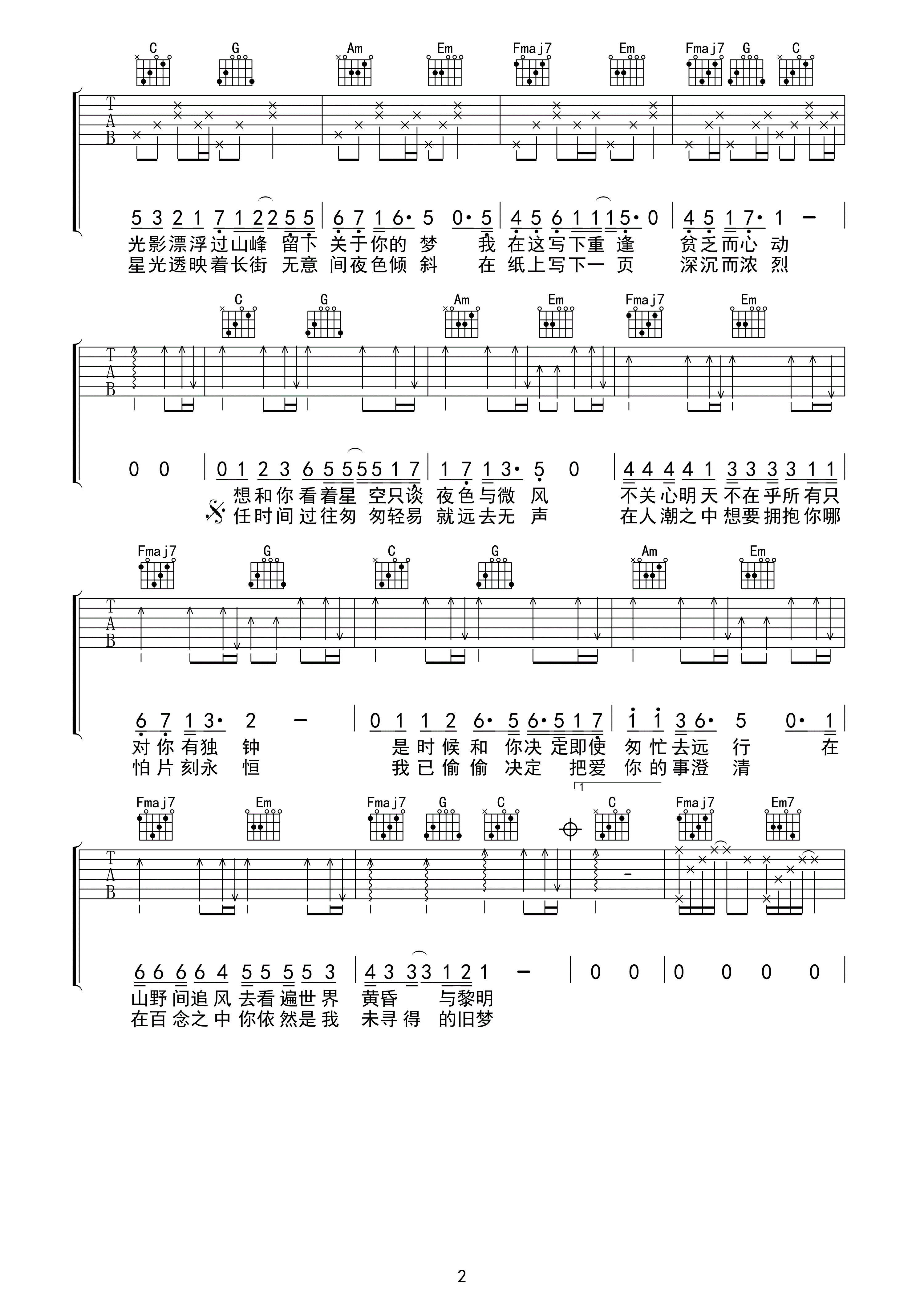 曲谱介绍: 孟凡明《只只》吉他弹唱谱,采用F调指法编配,皋尚艺琴行编配出品,共有3张高清图谱。