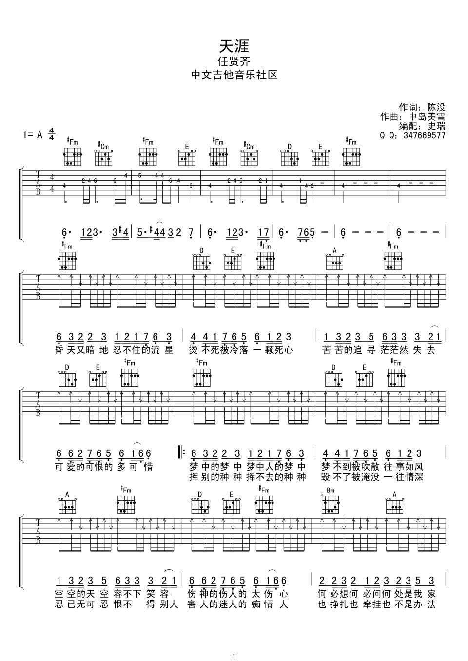 曲谱介绍: 任贤齐《天崖》吉他弹唱谱,采用A调指法编配,中文吉他音乐社区编配出品,共有2张高清图谱,免翻页排版设计。