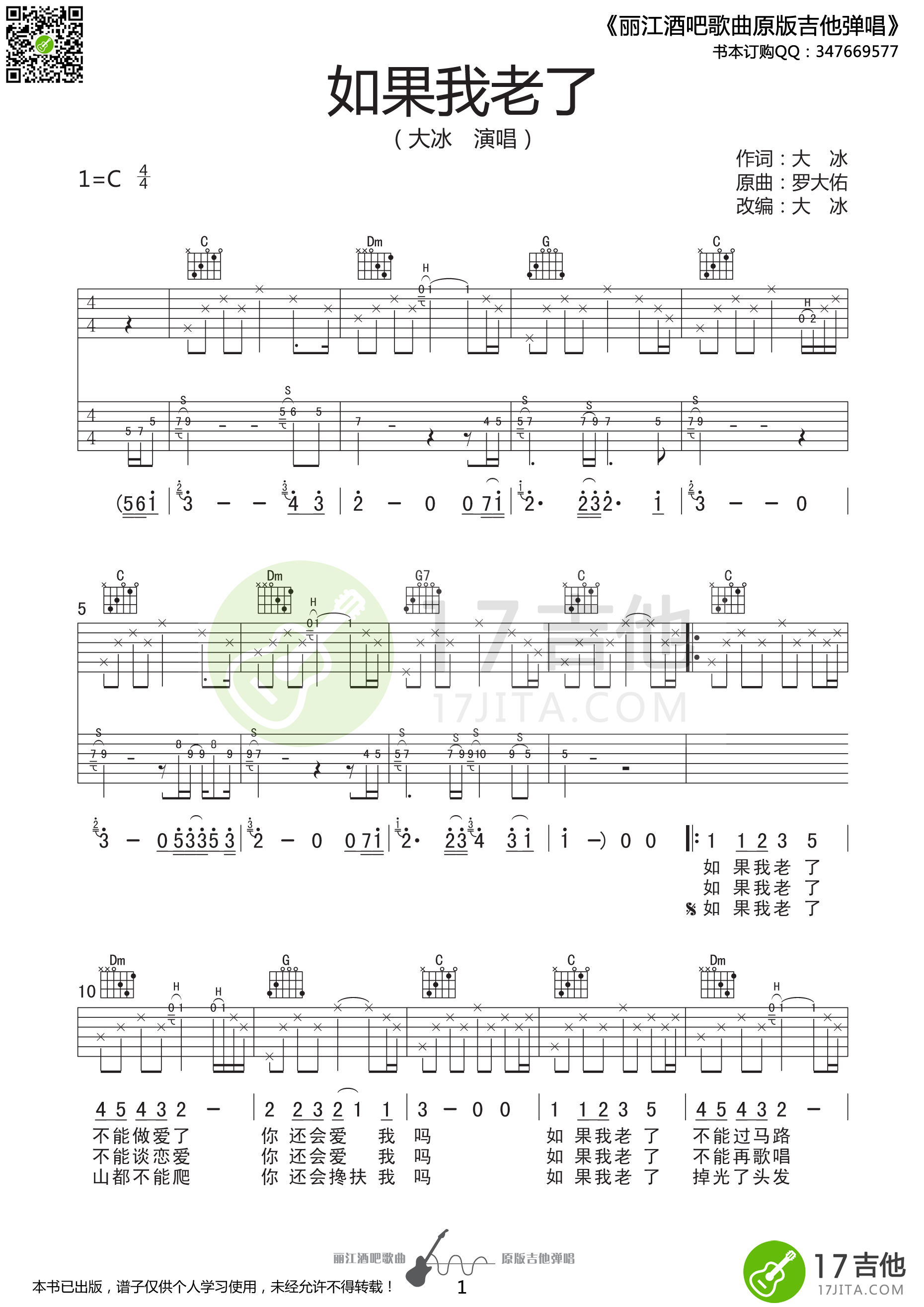 曲谱介绍: 大冰《如果我老了》吉他弹唱谱,采用C调指法编配,17吉他编配出品,共有3张高清图谱。