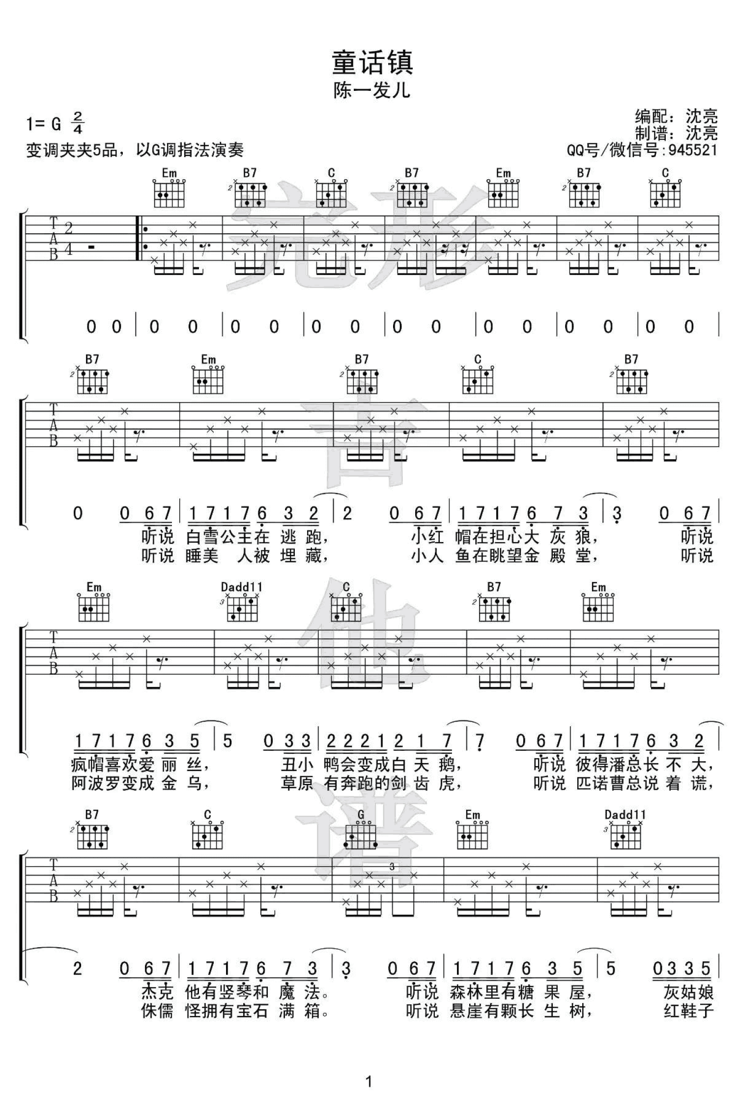 曲谱介绍: 童话镇吉他谱,斗鱼女主播陈一发儿的一首好听的歌曲,童话镇六线谱,变调夹夹五品,以G调指法演奏。本曲谱是根据原歌的和声编配,右手的节奏型比较有特点,注意休止的方法,可用右手抵住琴弦实现,同时左手辅助切音。为了能够自如的自弹自唱,个别处省略了细节变化。