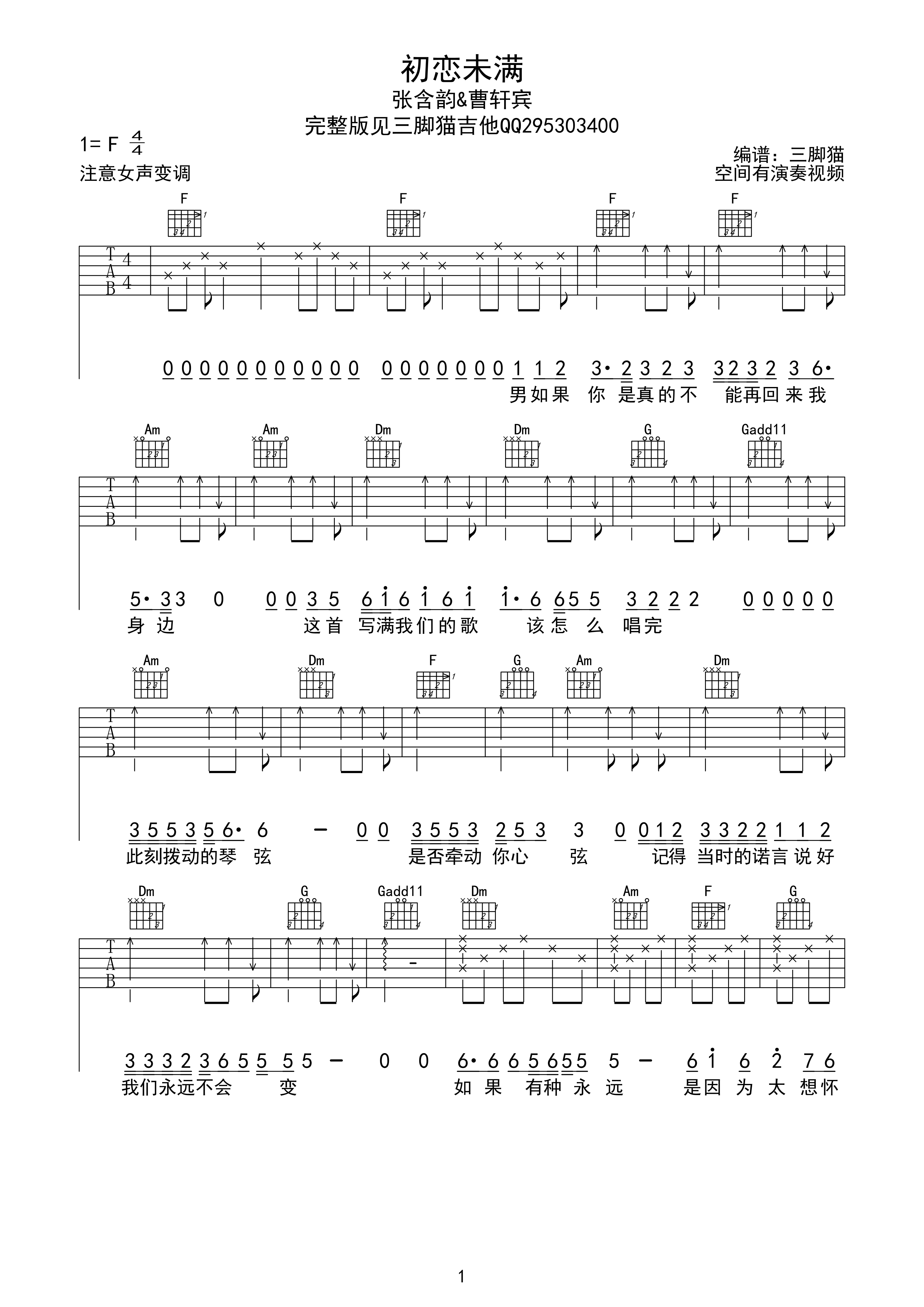 曲谱介绍: 曹轩宾《初恋未满》吉他弹唱谱,采用F调指法编配,三脚猫编配出品,共有4张高清图谱。