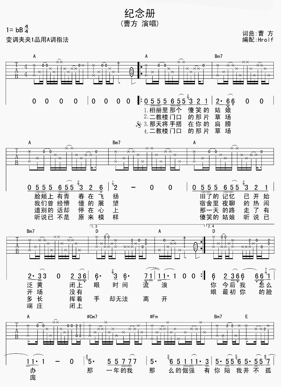 纪念册吉他谱 - 曹方 - B调吉他弹唱谱