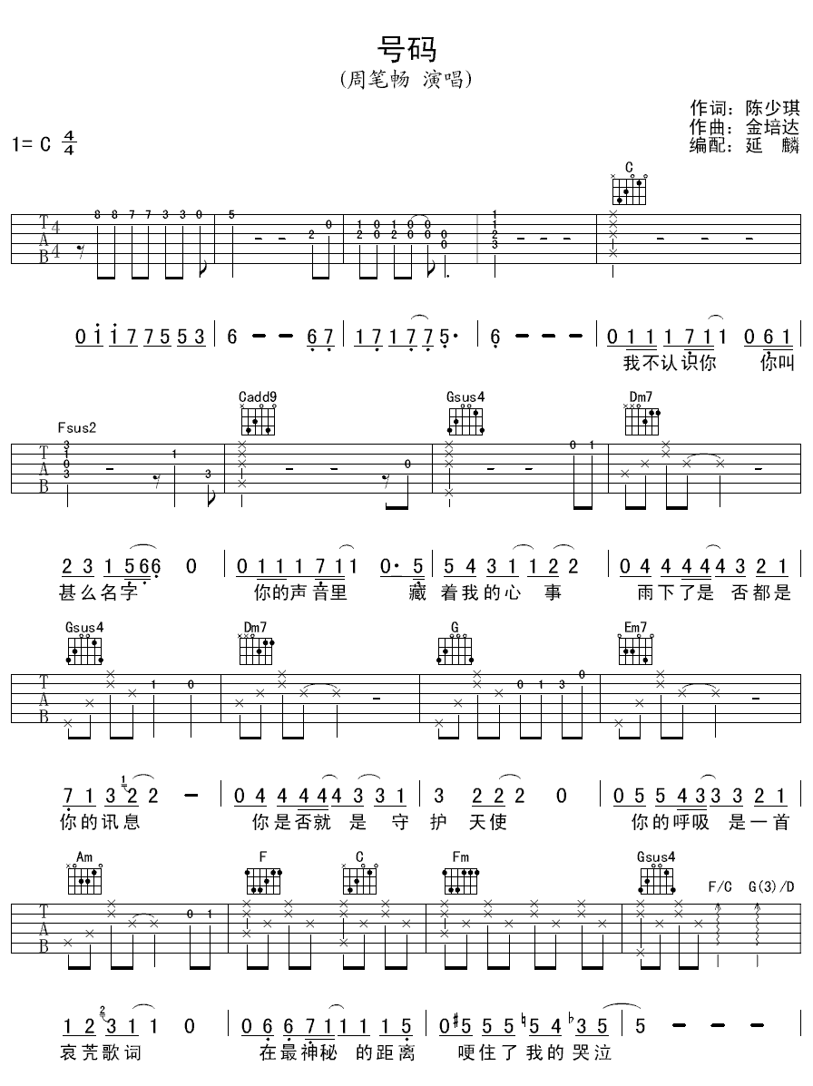 曲谱介绍: 周笔畅《号码》吉他弹唱谱,采用C调指法编配,延麟编配出品,共有2张高清图谱,免翻页排版设计。