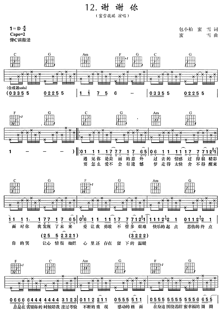 曲谱介绍: 蜜雪薇琪《谢谢你》吉他弹唱谱,采用D调指法编配,共有3张高清图谱。