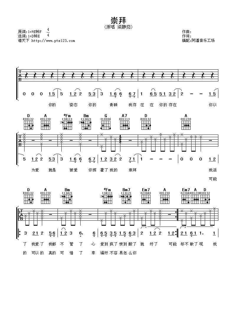 曲谱介绍: 梁静茹《崇拜》吉他弹唱谱,采用D调指法编配,阿潘音乐工场编配出品,共有3张高清图谱。