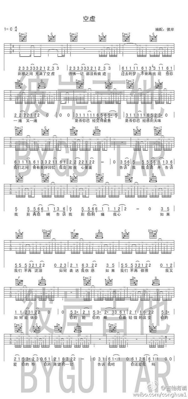 曲谱介绍: 张悬《空虚》吉他弹唱谱,采用C调指法编配,彼岸吉他编配出品,共有1张高清图谱,免翻页排版设计。