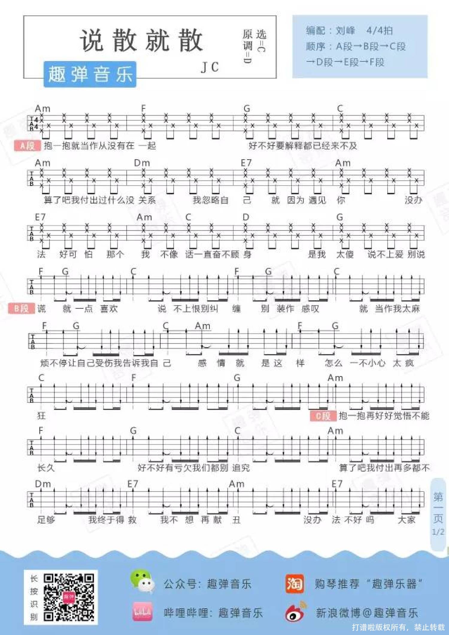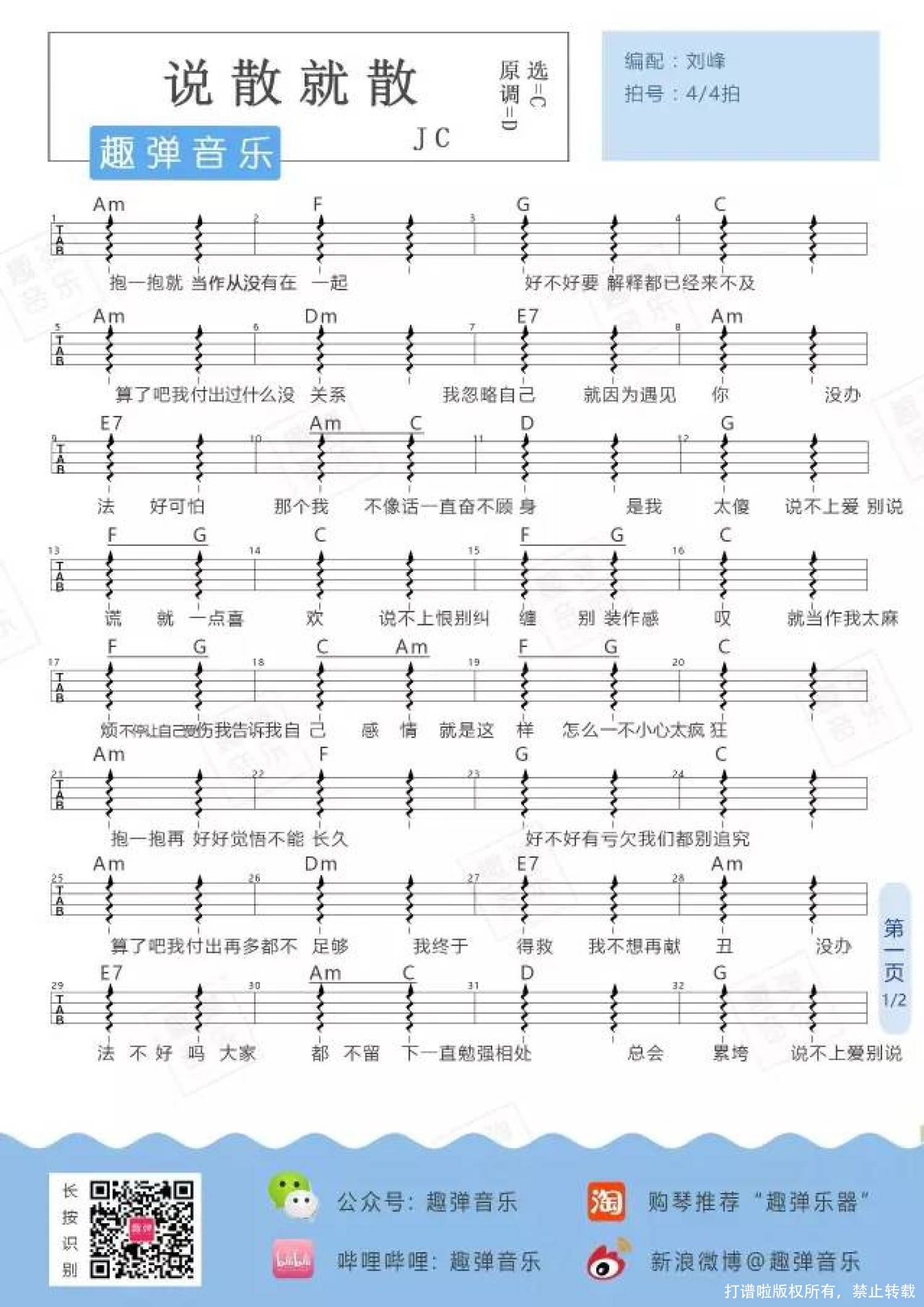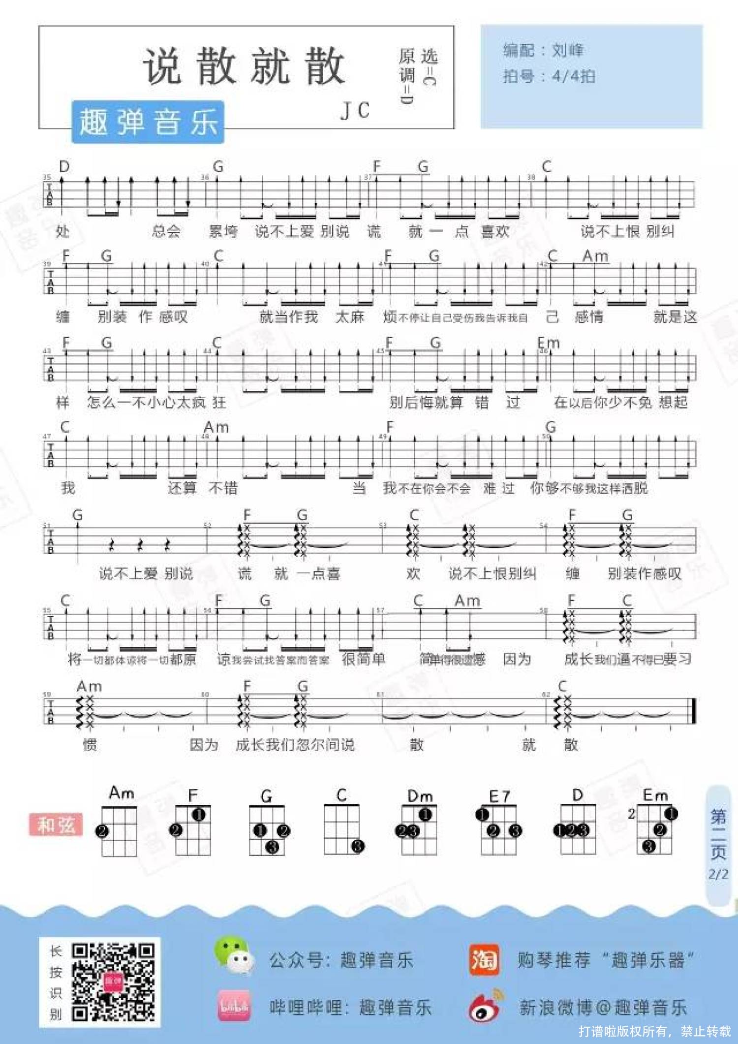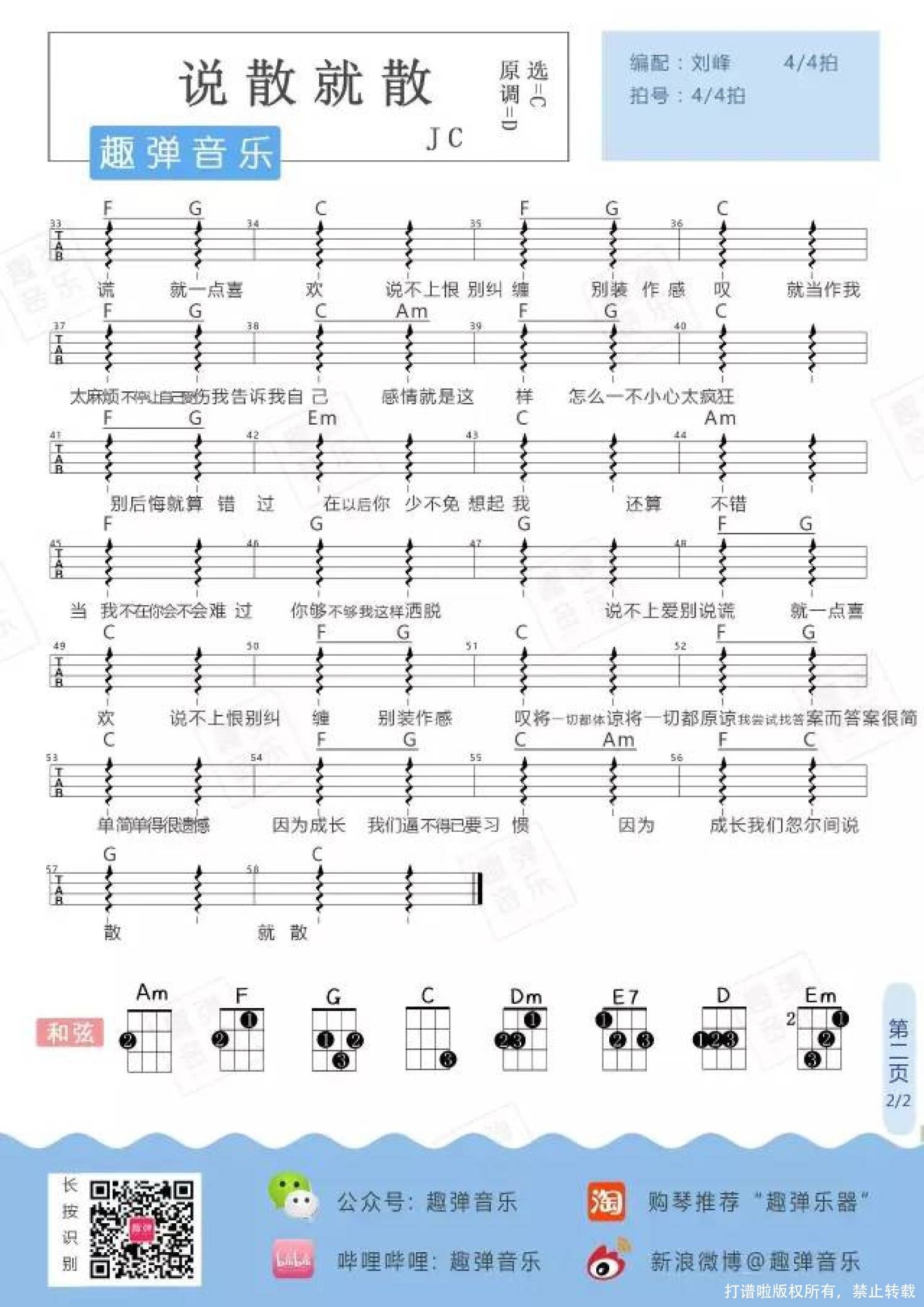 曲谱介绍: JC《说散就散》_C调尤克里里谱