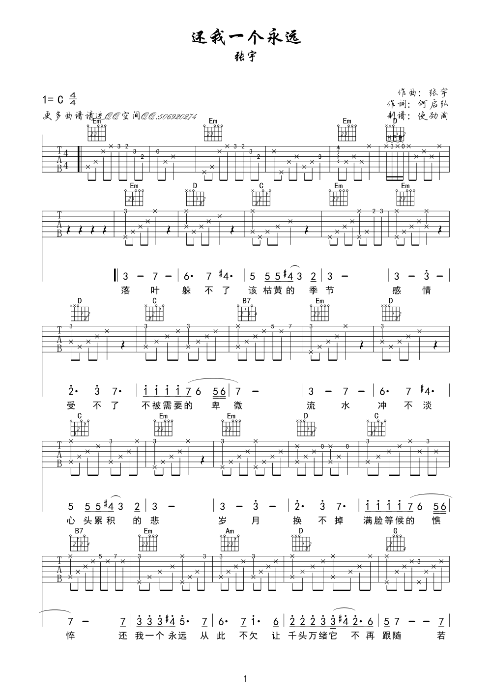曲谱介绍: 张宇《还我一个永远》吉他弹唱谱,采用C调指法编配,使劲淘编配出品,共有2张高清图谱,免翻页排版设计。