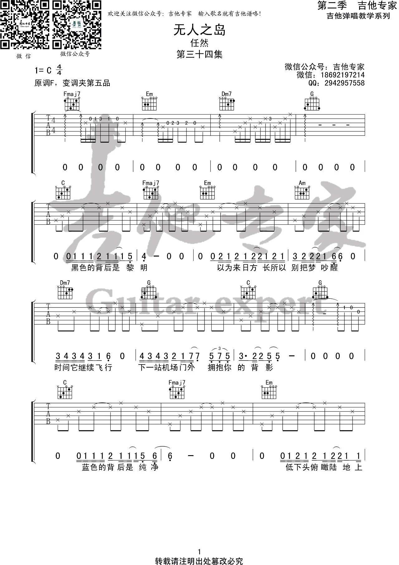 曲谱介绍: 无人之岛吉他谱采用了C调指法,由吉他专家编配完成。