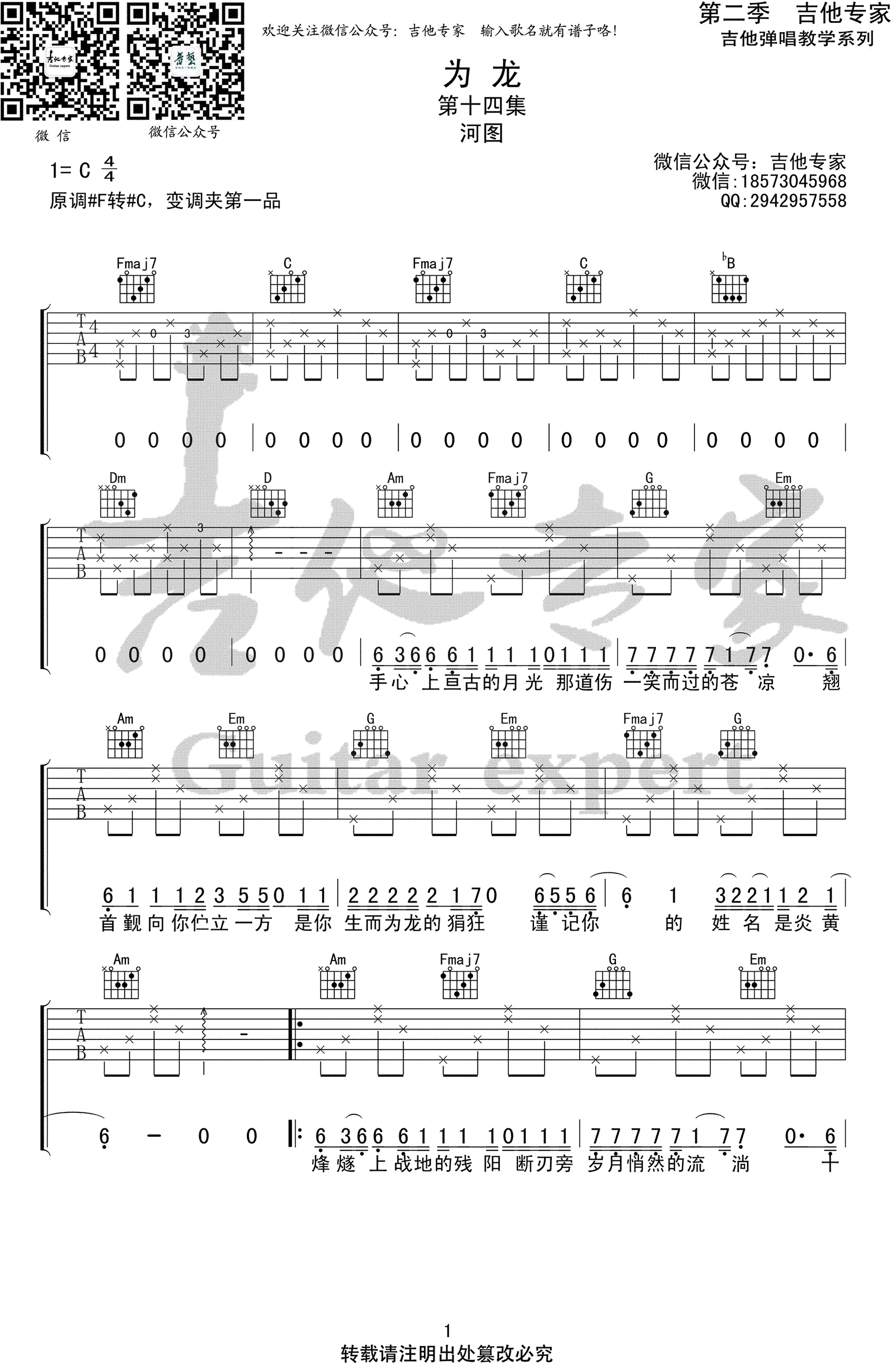 曲谱介绍: 河图《为龙》吉他弹唱谱,采用C调指法编配,吉他专家编配出品,共有3张高清图谱。
