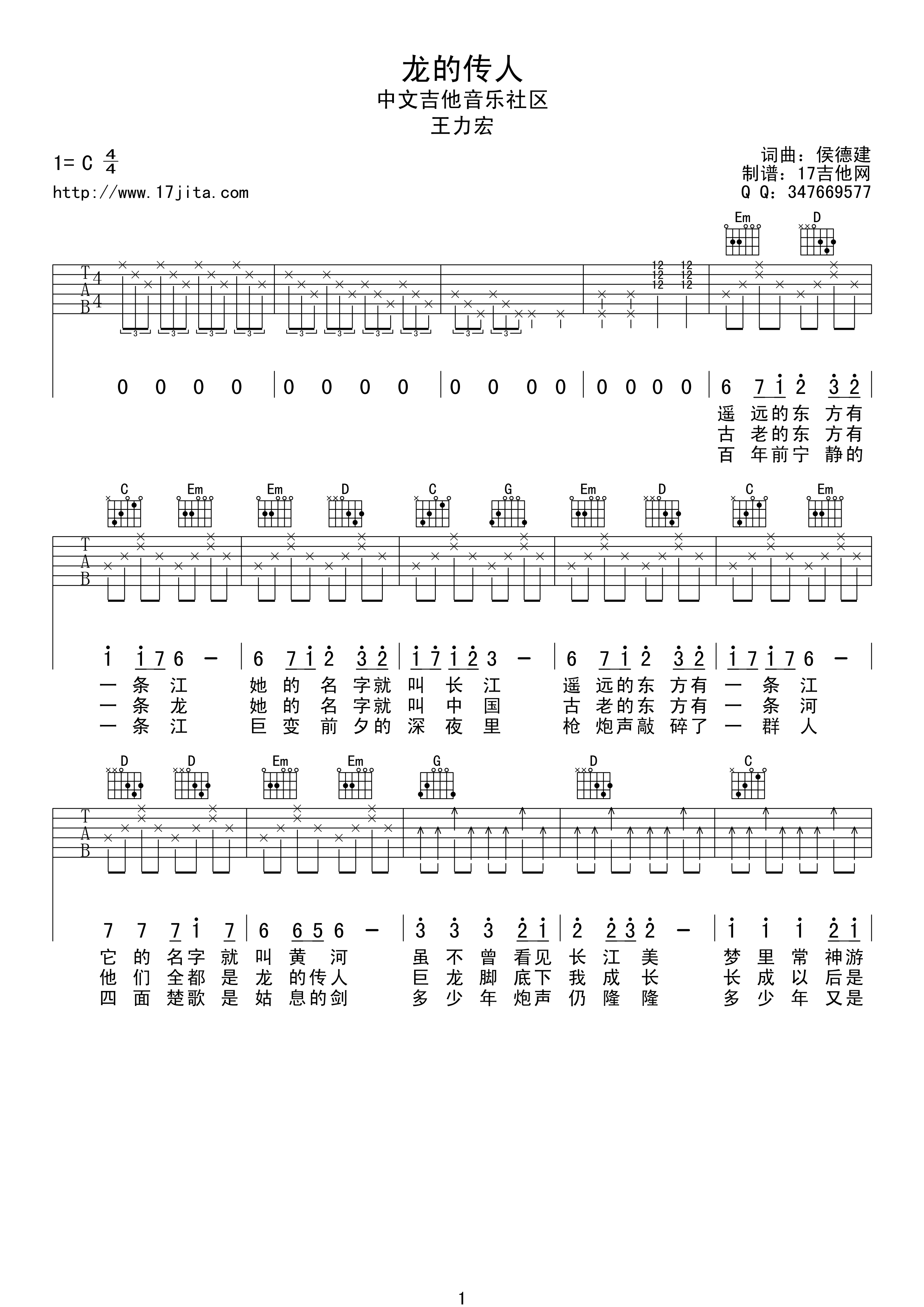 曲谱介绍: 王力宏《龙的传人》吉他弹唱谱,采用C调指法编配,17吉他编配出品,共有2张高清图谱,免翻页排版设计。