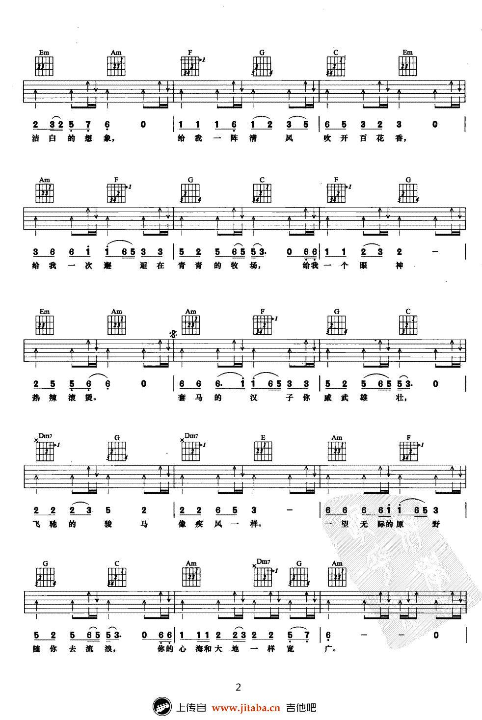 曲谱介绍: 乌兰图雅《套马杆》吉他弹唱谱,采用C调指法编配,吉他吧编配出品,共有3张高清图谱。