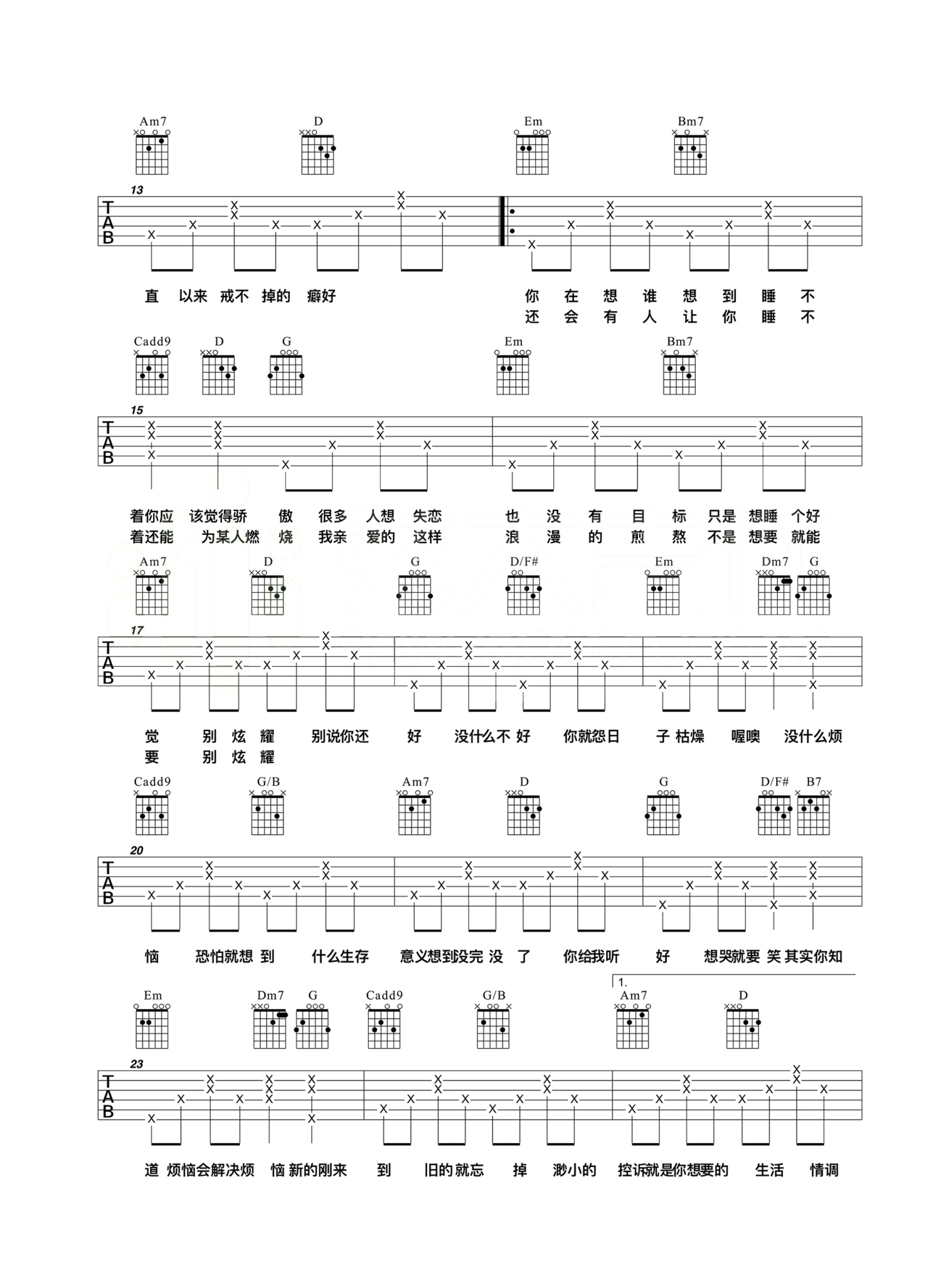 曲谱介绍: 你给我听好吉他谱,陈奕迅演唱,林夕词,林俊杰曲,你给我听好六线谱,女生弹唱可以选用变调夹夹五品,其实你知道,烦恼会解决烦恼,新的刚来到,旧的就忘掉。陈奕迅版本的《你给我听好》,是一个单身的人通过控诉他矫情的朋友来阐述自己内心寂寞的心情,大概是“这样浪漫的煎熬,不是想要就能要。”这种潜台词。张碧晨版本的完全不同了,是一个小女生在用第二人称跟自己对话,反讽自己总是遇不到最完美的情调,虽然在外人看来感情很丰富,其实是“总为爱情折腰”这样的苦恼。