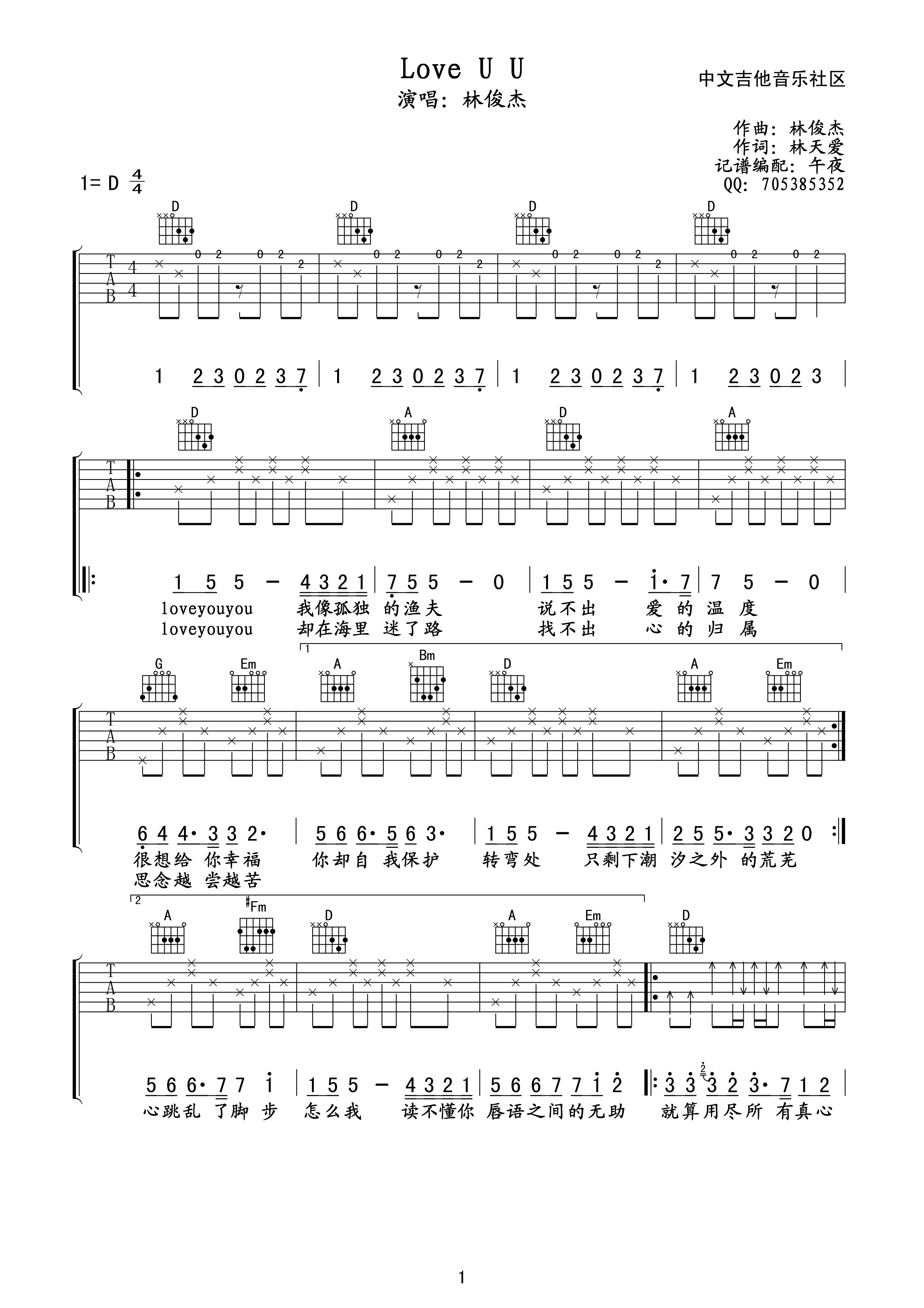 曲谱介绍: Love《Loveyouyou》吉他弹唱谱,采用D调指法编配,中文吉他音乐社区编配出品,共有3张高清图谱。