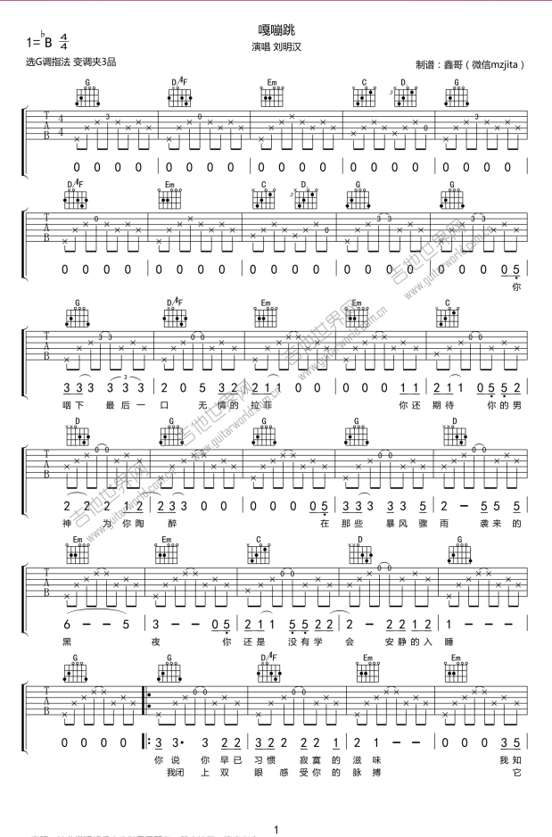 曲谱介绍: 刘明汉《嘎嘣跳》吉他弹唱谱,采用B调指法编配,吉他世界网编配出品,共有3张高清图谱。