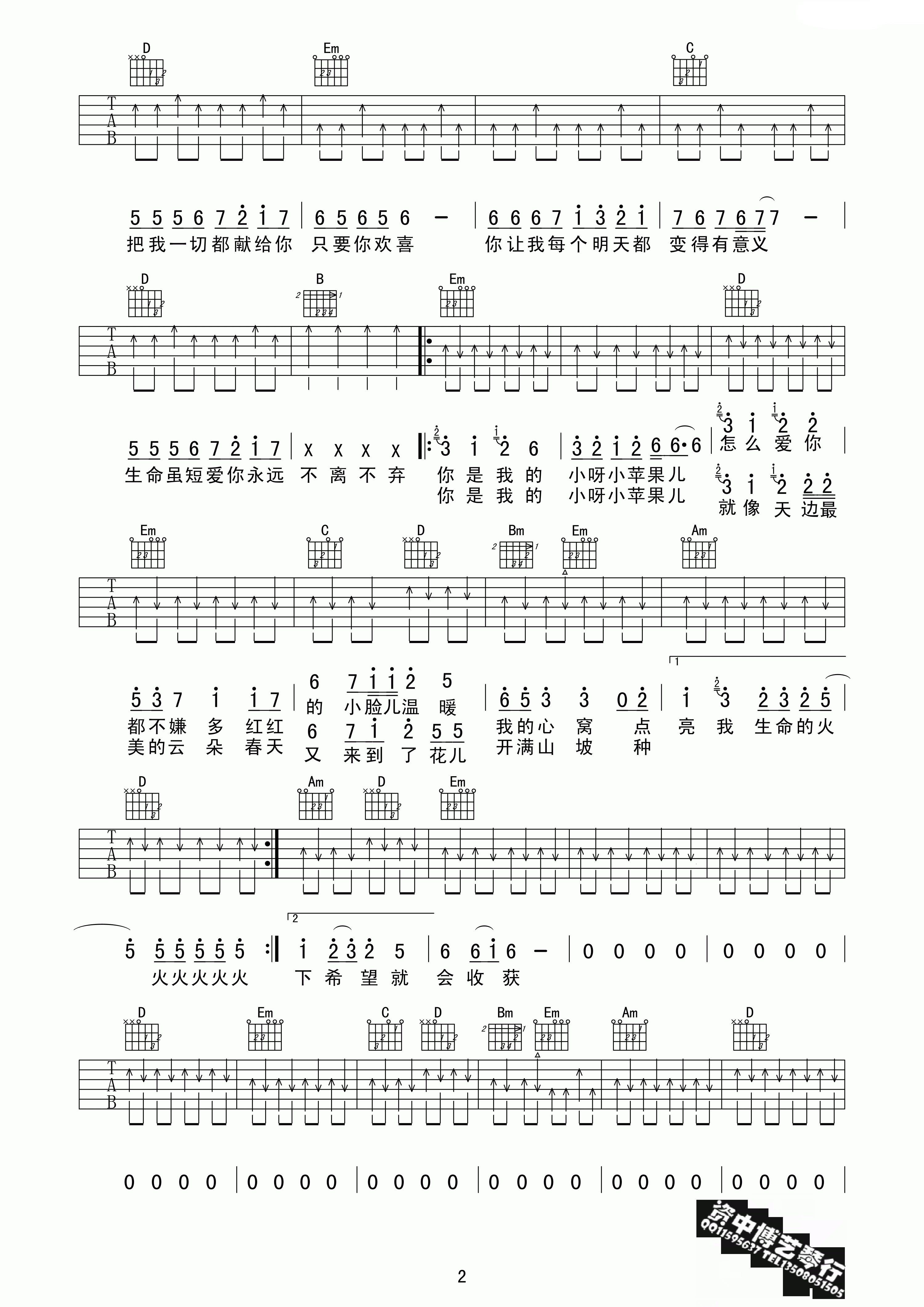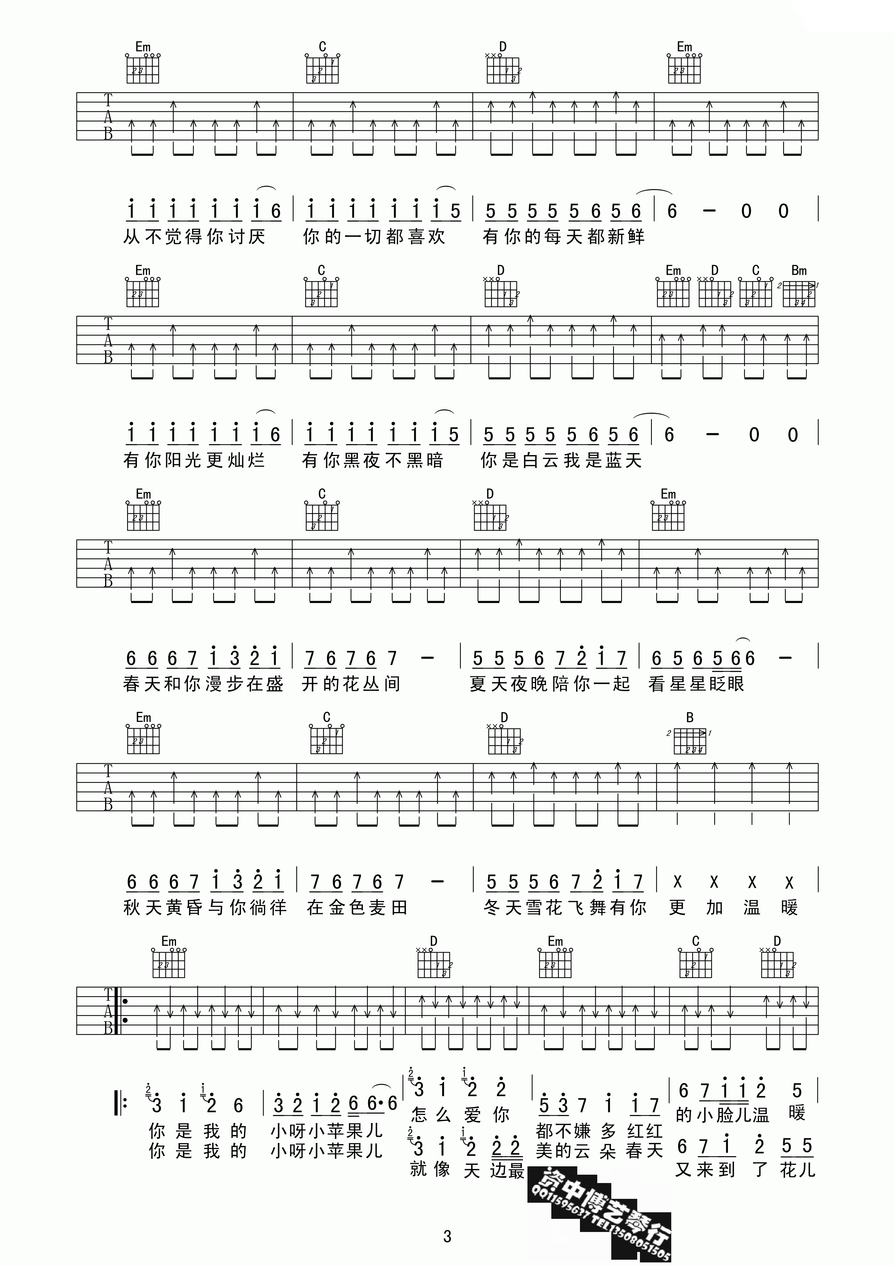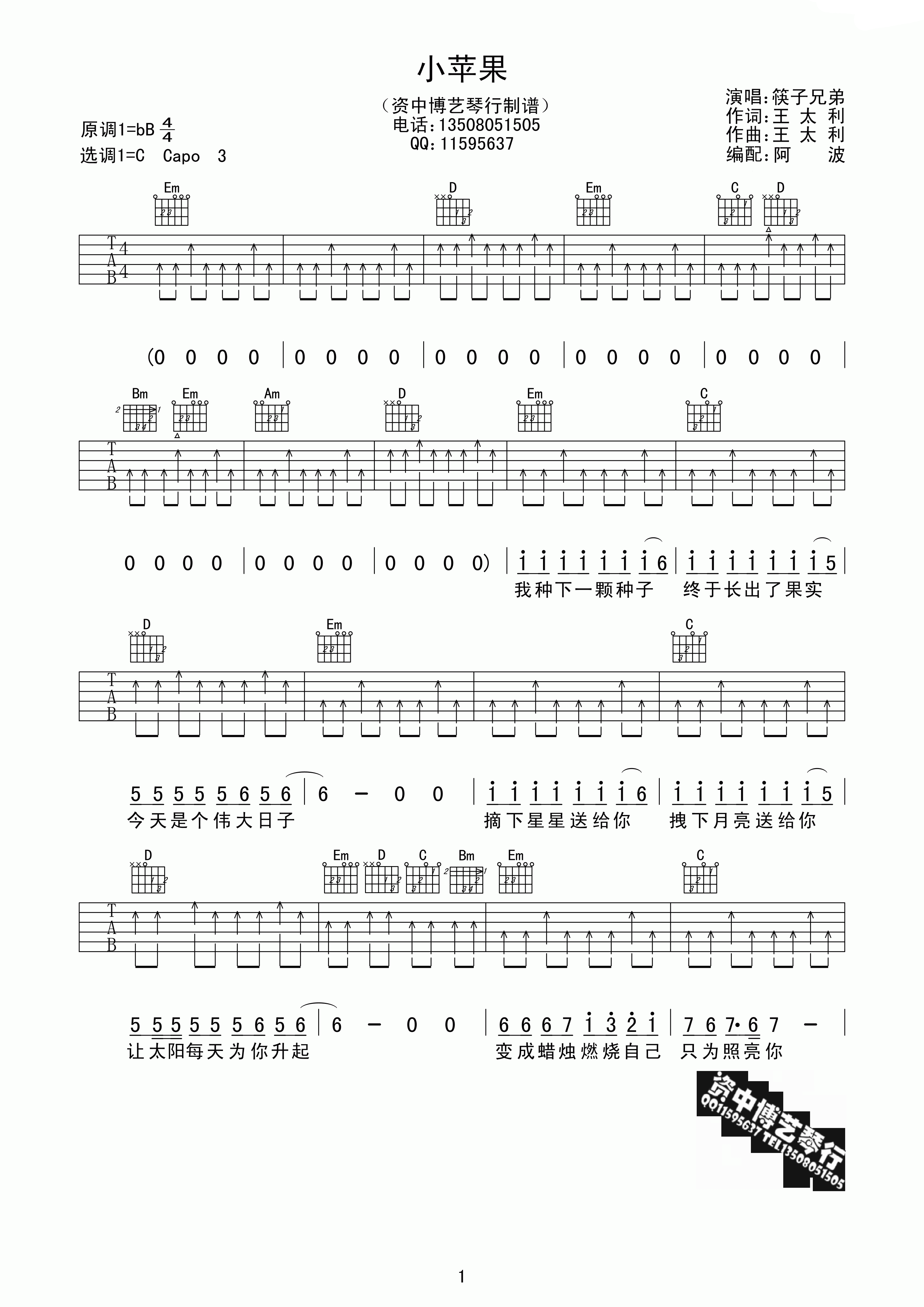 曲谱介绍: 筷子兄弟《小苹果》吉他弹唱谱,采用C调指法编配,资中博艺琴行编配出品,共有4张高清图谱。