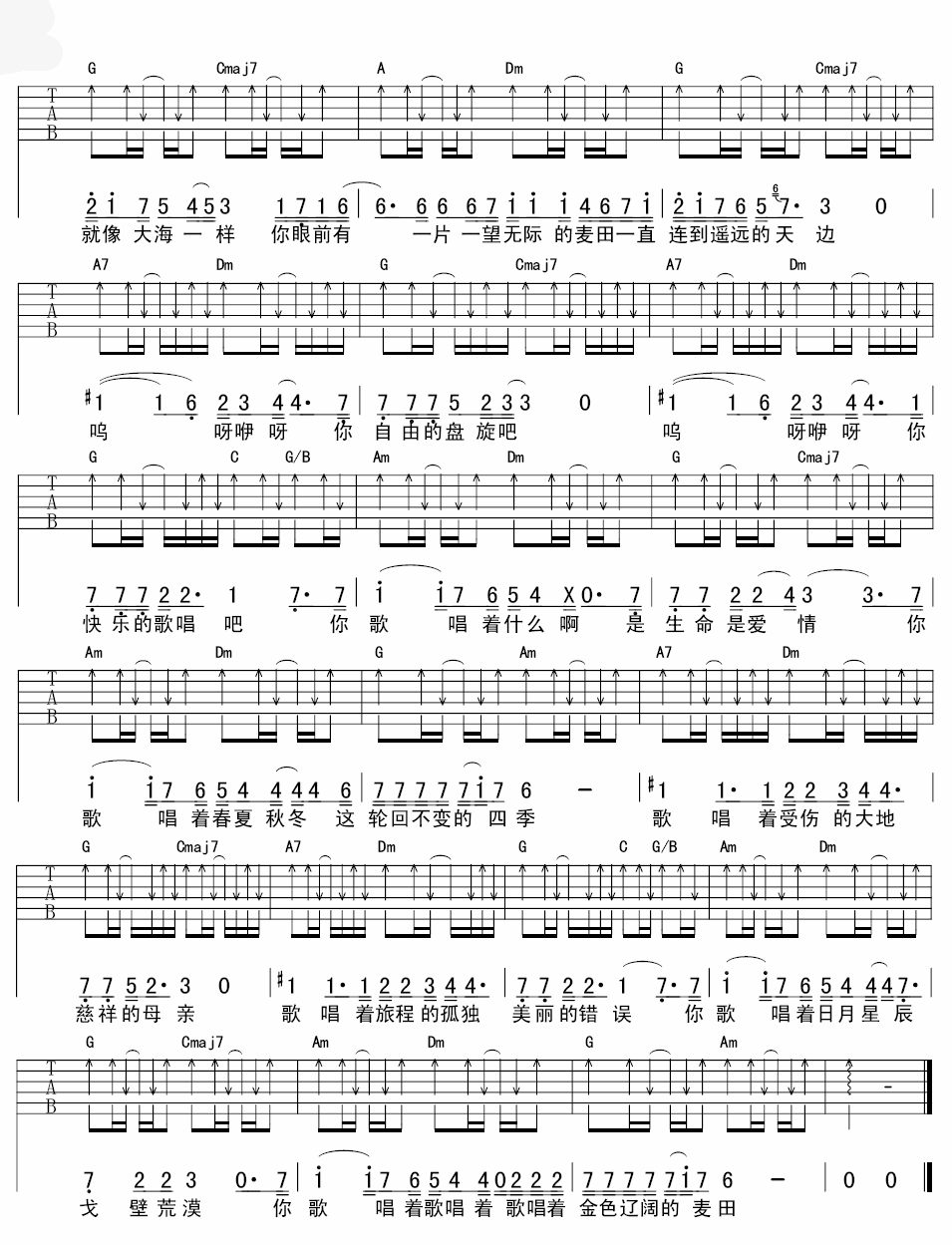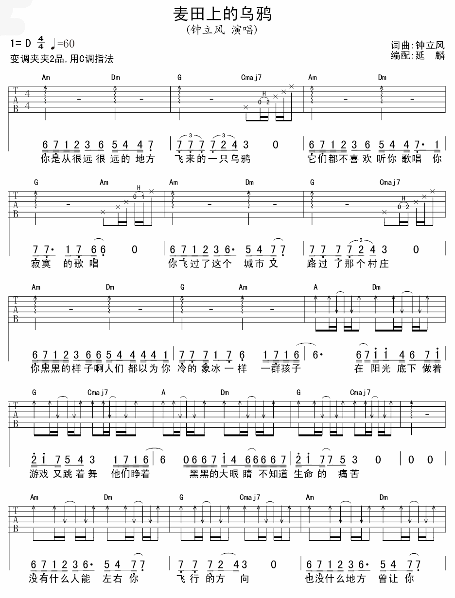曲谱介绍: 钟立风《麦田上的乌鸦》吉他弹唱谱,采用D调指法编配,延麟编配出品,共有3张高清图谱。