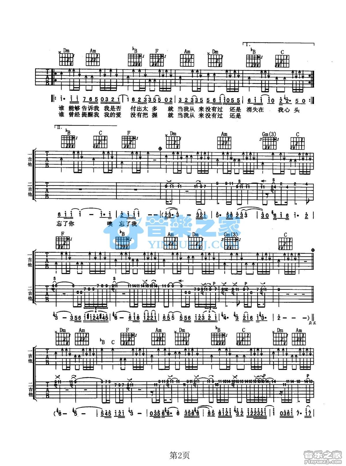 曲谱介绍: 王杰《忘了你忘了我》吉他弹唱谱,采用F调指法编配,音乐之家编配出品,共有3张高清图谱。