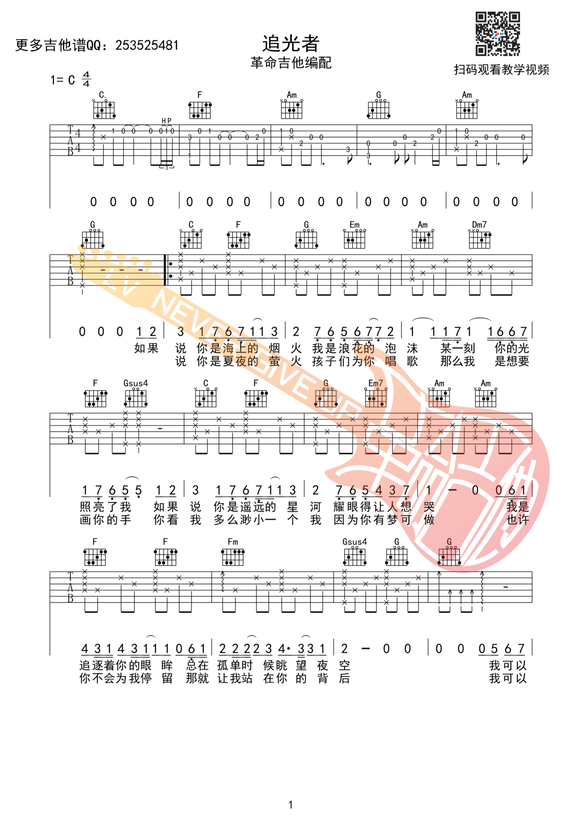 曲谱介绍: 追光者吉他谱采用了C调指法,由革命吉他编配完成。《追光者》这首歌曲是一首很触动人心的音乐作品,这首歌曲总是能够勾起内心的回忆,在这首歌曲的演绎之中,岑宁儿的嗓音挺有磁性,很文艺的气息。
